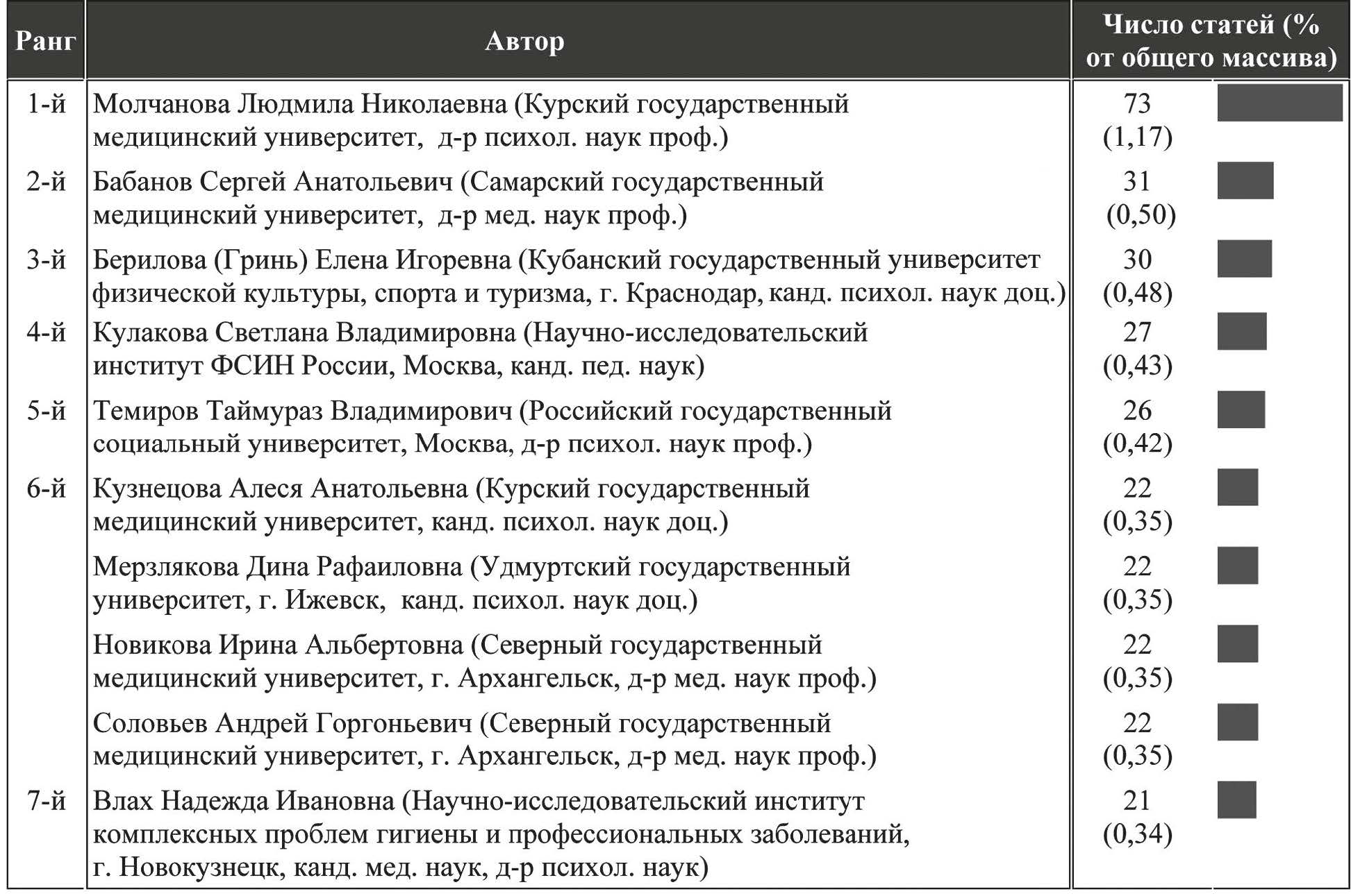 Ведущие авторы. На рис. 8 указаны 10 авторов, опубликовавших наибольшее количество статей, их наукометрические показатели, в том числе, данные по всем статьям, проиндексированным в РИНЦ за аналогичный период времени, – в табл. 2.