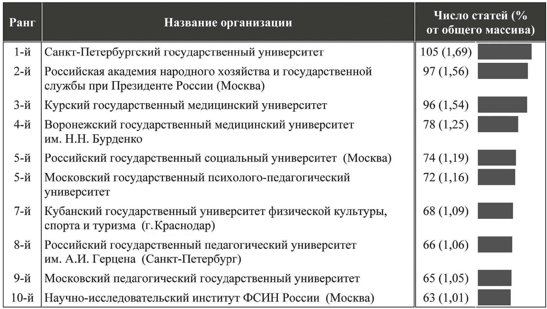 Отмечаются невысокие наукометрические показатели в массиве статей по профессиональному выгоранию. Не более 10 % публикаций были изданы в высокорейтинговых отечественных и зарубежных журналах. Процитированы хотя бы 1 раз только 59 % статей, среднее число цитирований в расчете на 1 статью оказалось 3,29, на 1 соавтора – 1,62. Журналов, ядро которых содержало бы максимальное число статей по профессиональному выгоранию, не выявлено. В ведущих журналах публиковалось не более 1 % статей массива по профессиональному выгоранию и 0,1 % – от всех статей, изданных в журнале.