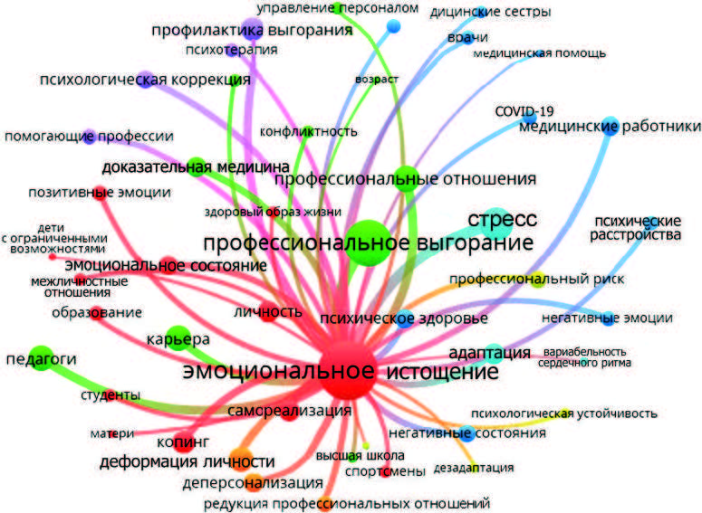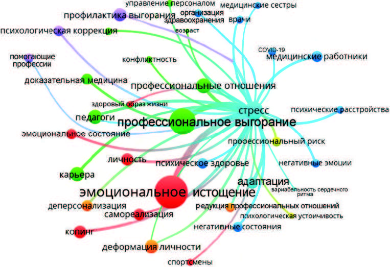 В статьях выявлены высокие взаимоотношения ведущих обобщенных ключевых слов в кластерах, например, самый выраженный термин – эмоциональное истощение – встречался со словосочетанием профессиональное выгорание в 504 статьях, с ключевым словом стресс – в 485 статьях, со словосочетанием профессиональные отношения – в 289, деформация личности – в 263, деперсонализация – в 223, профилактика выгорания – в 240, педагоги – в 293, медицинские работники – в 135 статьях и т.д. (рис. 11).