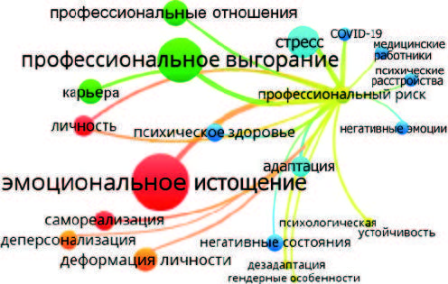 Обсуждение. К сожалению, не все авторы в статьях указывали, какой методологический аспект развития ПВ они используют, в связи с чем применяемые методические приемы оценки давали значительную вариабельность показателей ПВ у обследуемых лиц. Нередко оценка психического компонента (эмоциональной составляющей) трактовалась как ПВ, из-за чего и отмечается высокая его распространенность у работающих. Самым частым ключевым словом в статьях было словосочетание эмоциональное выгорание, чтобы не принимать его за реальное ПВ, оно было заменено при семантическом и кластерном анализе на термин эмоциональное истощение.
