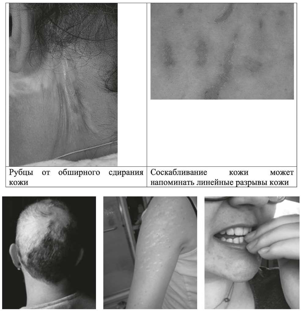 Однако многим пострадавшим людям часто недостаточно просто знать об этих возможных последствиях, чтобы избавиться от своей дисфункциональной привычки. Многие пациенты чувствуют, что находятся во власти своего поведения. Размеры поражений могут варьироваться от нескольких миллиметров до нескольких сантиметров. Они могут возникать на любой части тела, но чаще встречаются на лице и видимых участках кожи (руки, бедра, живот, грудь). Иногда пораженная часть тела может иметь особое значение (например, грудь и гениталии у пациентов, подвергшихся сексуальному насилию). Иногда доминирующая рука пациента может иметь значение (например, левая сторона тела может быть более активно задействована у правшей, а середина спины может быть обойдена вниманием из-за ее относительной недоступности) [4]. Морфология варьируется от поверхностных эрозий до глубоких изъязвлений и даже изменений лицевых и других структур кожи (рис. 1).