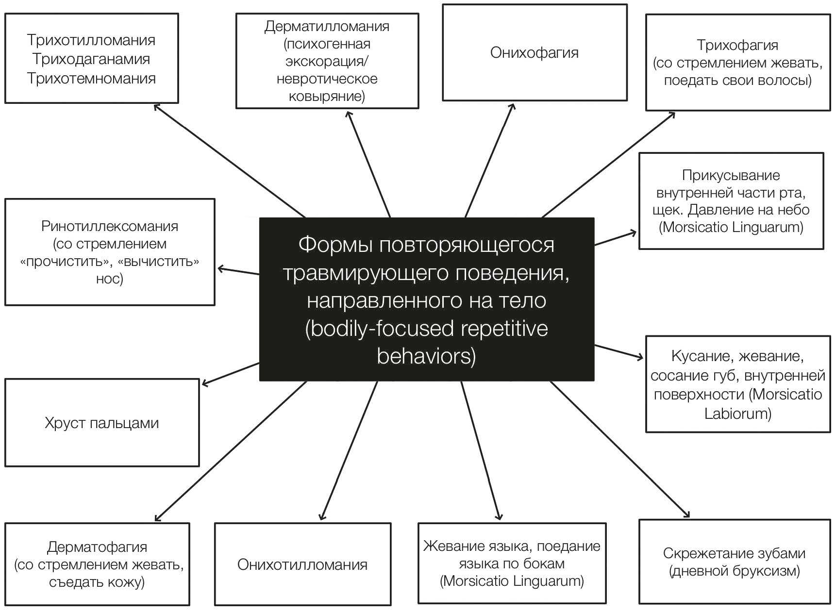 В зарубежной психиатрии и клинической психологии эти проявления получили общее название повторяющегося травмирующего поведения, направленного (сфокусированного) на тело (body-focused repetitive behaviors, BFR [3]), или расстройства трамирования кожи (skin picking disorders) как гетерогенного заболевания, сопровождающегося большим спектром часто рецидивирующих, деструктивных, нефункциональных форм поведения (рис. 2), которые могут быть одиночными или смешанными (multiple BFRR [2]), часто предназначены для «удаления чего-то» и/или «избавления от…», являются индикатором сбоя в эмоциональной регуляции пациента («интенсивные эмоции», «страсти», «совершила ошибку», «сильные эмоции захлестнули», «негативизм к себе, и ненавижу себя, и не знаю, что с этим делать»), а также присутствия режима излишней придирчивости к себе («нужно быть хорошей», «ответственной», «нормальной», «нравиться»), пунитивности («какого фига ты не работала сегодня»), самопожертвования (не говорю, не выражаю), поиска точки опоры («дает мне связь с реальностью»).