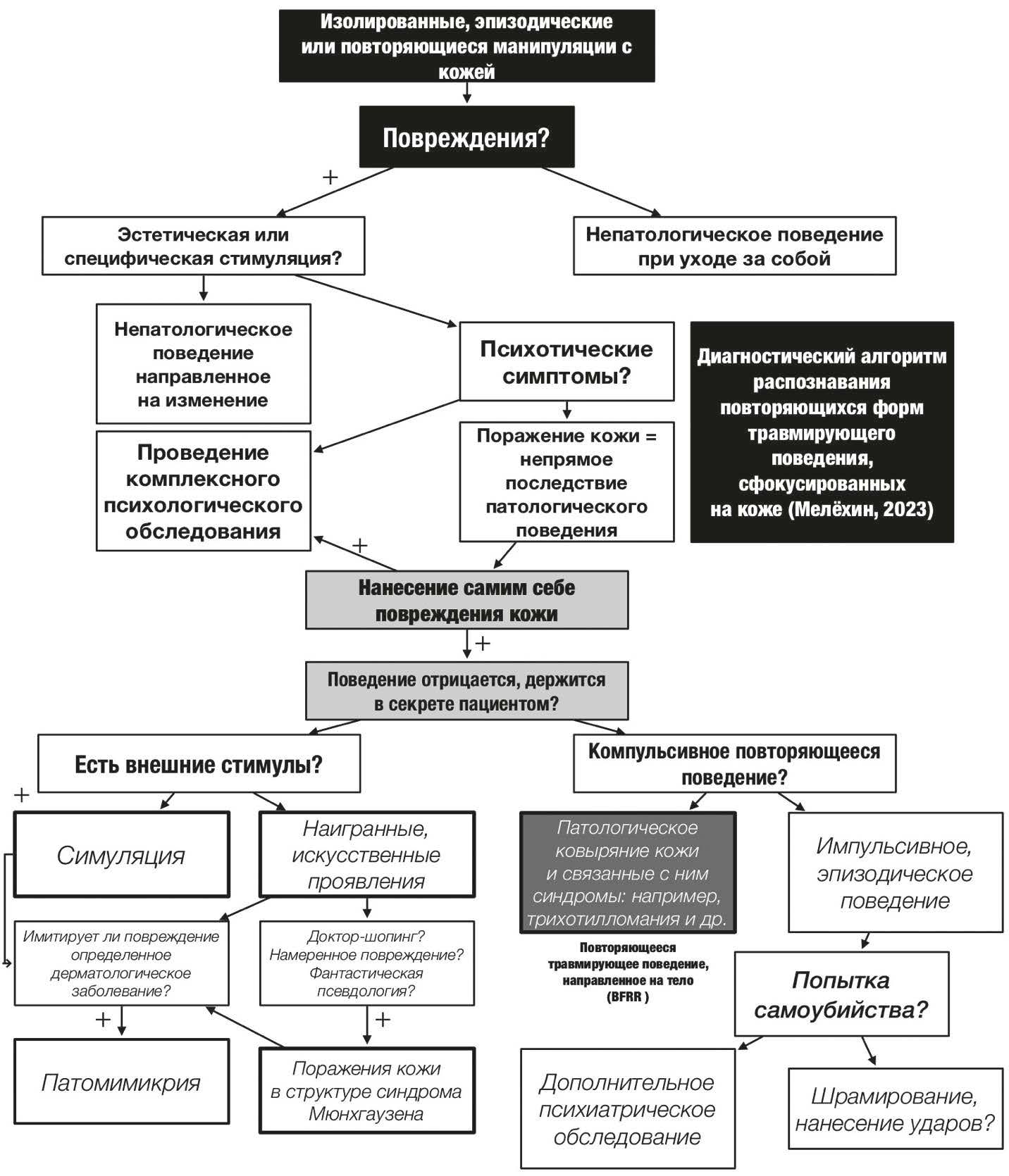 Рис. 3. Диагностический алгоритм распознавания повторяющегося травмирующего поведения, направленного (сфокусированного) на тело, или расстройства травмирования кожи