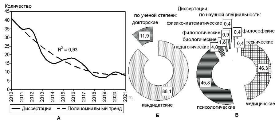 Полиномиальный тренд при очень высоком коэффициенте детерминации (R2 = 0,93) показывал уменьшение числа диссертационных исследований (см. рис. 1А): если в 2010 г. с психотерапией и психологической коррекцией соотносилась 41 отечественная диссертация, то в 2021 г. их было только 8 – уменьшение в 5,1 раза (!). В 2010–2021 гг. в среднем ежегодно представлялись в диссертационные советы 19 диссертаций, при медиане с верхним и нижним квартилем – 16 [9; 27] работ.