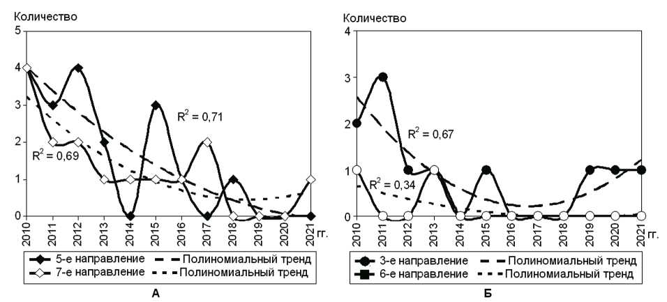 Направление научных исследований. Развитие направлений научных исследований в авторефератах диссертаций наглядно показано на рис. 2, 3. Полиномиальные тренды при разных по значимости коэффициентах детерминации демонстрировали уменьшение данных по всем направлениям.