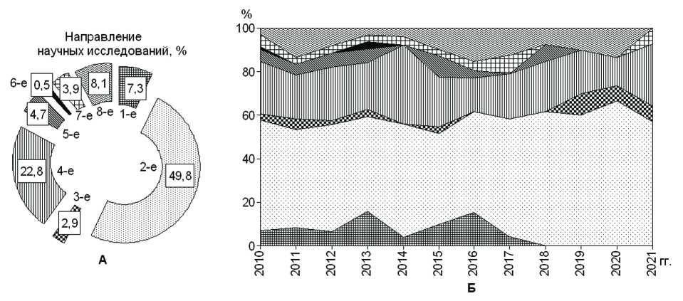 Рис. 4. Структура (А) и динамика структуры (Б) направлений научных исследований