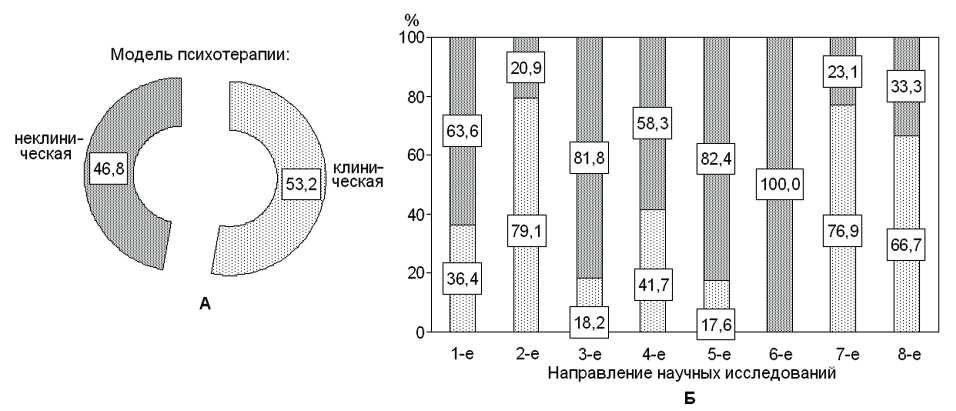Модель психотерапии. В общем массиве диссертационных работ модели психотерапии изучались практически в одинаковых количествах (рис. 7А). В то же время в диссертациях с изучением форм и методов психотерапии и психологического воздействия с учетом нозологических, синдромальных, социально-демографических, культуральных и индивидуально-психологических характеристик (2-е направление) клиническая модель психотерапии была в 79,1 % работ; с оказанием психологической помощи в экстремальных и кризисных ситуациях (3-е направление) в 81,8 % использовали неклинические психотерапевтические подходы, а в диссертациях с изучением личности психотерапевта и консультанта, их взаимодействия в процессе психотерапии и психологической помощи (6-е направление) неклиническую модель психотерапии использовали в 100 % случаев (см. рис. 7Б).