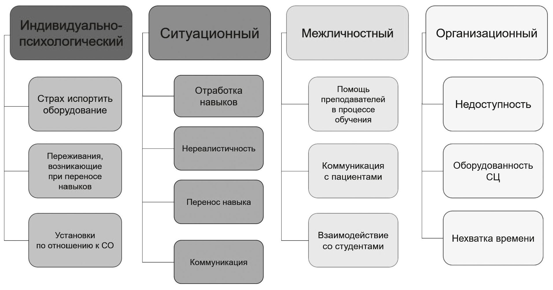 Первый тематический блок – индивидуально-психологический – включает следующие категории: «переживания при переносе навыков»; «установки по отношению к СО»; «страх испортить оборудование».