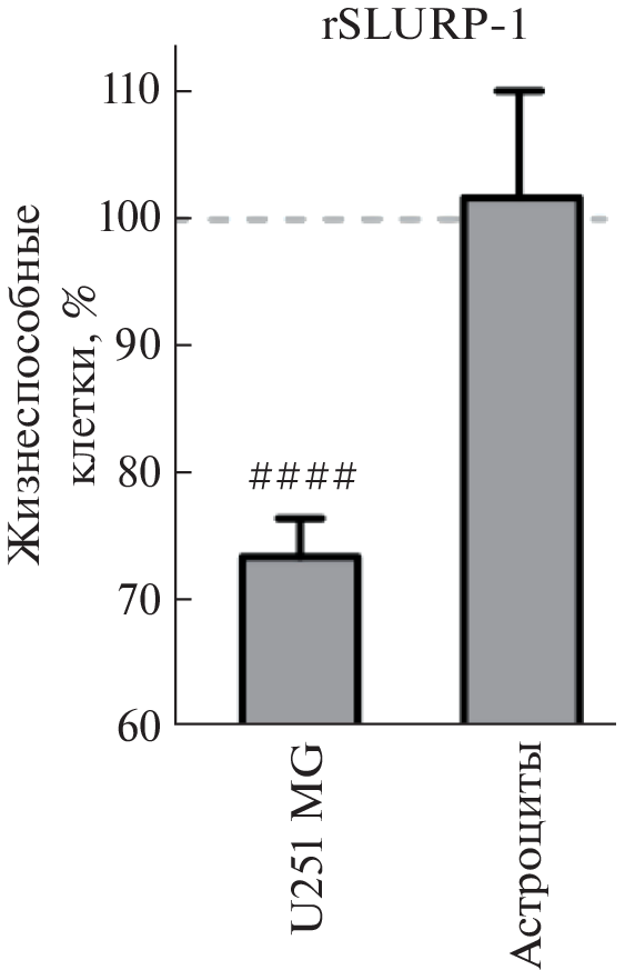 A recombinant analog of the human SLURP-1 protein (rSLURP-1) effectively inhibits the growth of carcinomas by interaction with the α7-type nicotinic acetylcholine receptor. Recently, rSLURP-1 inhibition of gliomas growth in vitro was shown by the authors, although, the mechanism of rSLURP-1 action was not studied. Here, we showed that rSLURP-1 selectively inhibits the growth of U251 MG glioma cells but not of normal astrocytes, and controls glioma cell migration. In addition, rSLURP-1 induces cell cycle arrest in the G2/M phase in U251 MG glioma cells, but does not result in apoptosis. Incubation of U251 MG cells with rSLURP-1 causes inhibition of phosphorylation of ERK, p38 MAPK, and AKT kinases, the activation of which contributes to the progression of gliomas. At the same time, rSLURP-1 does not affect the activity of JNK kinase. Thus, rSLURP-1 is an endogenous protein promising for the development of drugs based on it for the treatment of not only carcinomas, but also gliomas.