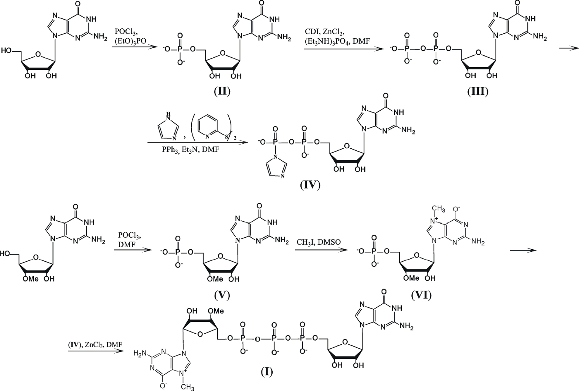 На последней стадии синтеза мы использовали активированный 5′-дифосфат гуанозина (IV) и 5′-монофосфат 7,3′-О-диметилгуанозина (VI). Схема синтеза динуклеотида ARCA (I) приведена на рис. 2.
