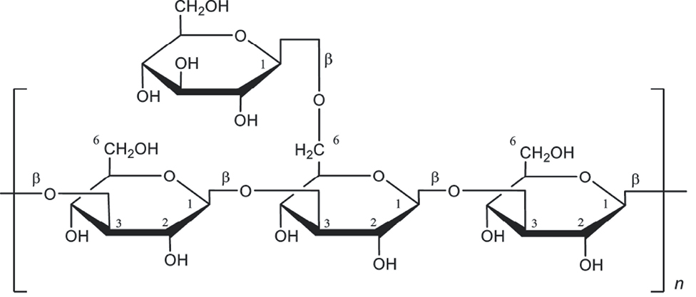 Большинство полисахаридов, выделенных из грибов, обладающих противоопухолевыми свойствами, представляют собой глюканы [5]. Глюканы имеют либо линейную, либо разветвленную структуру, состоящую из молекул глюкозы. Боковая цепь содержит остатки различных моносахаров. Показано, что полисахариды, содержащиеся в базидиальных грибах, накапливаются в плодовых телах, спорах. Наибольшая концентрация полисахаридов наблюдается в мицелии. Эти полисахариды, как сказано выше, различаются по своей химической структуре, но все имеют β-(1,3)-глюкановые группы в основной цепи и β-(1,6)-глюкановые группы в разветвленных участках. По-видимому, именно полисахариды, имеющие такие ответвления, и проявляют биологическую активность (рис. 1).