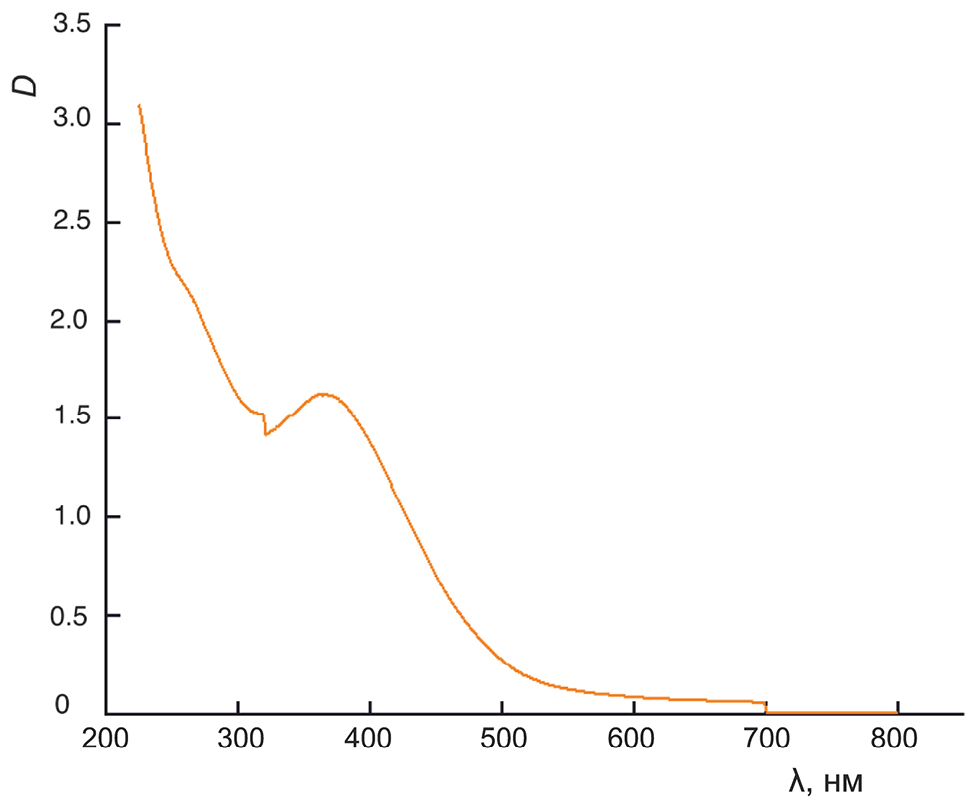 Проведен УФ-спектральный анализ содержания меланина в водорастворимых фракциях полисахаридов (GW), выделенных из базидиомицетного сырья (рис. 2). Показано, что в области 320–360 нм наблюдаются полосы поглощения, соответствующие полосам поглощения меланина [16].