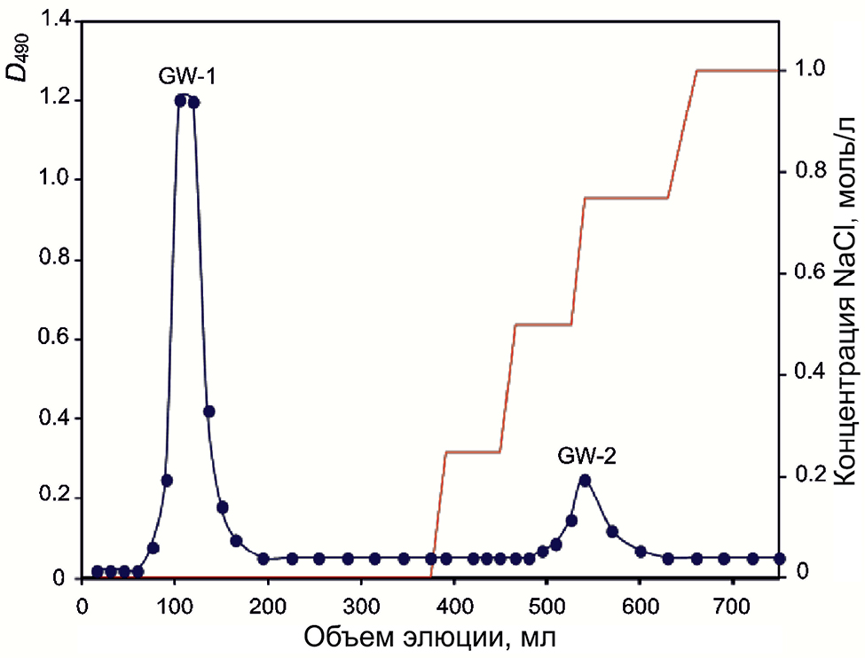На рис. 3. представлена хроматограмма разделения полученных из базидиомицетного сырья фракций полисахаридов на DEAE-целлюлозном сорбенте, с помощью которого были разделены нейтральные (GW-1) и анионные (GW-2) полисахариды.