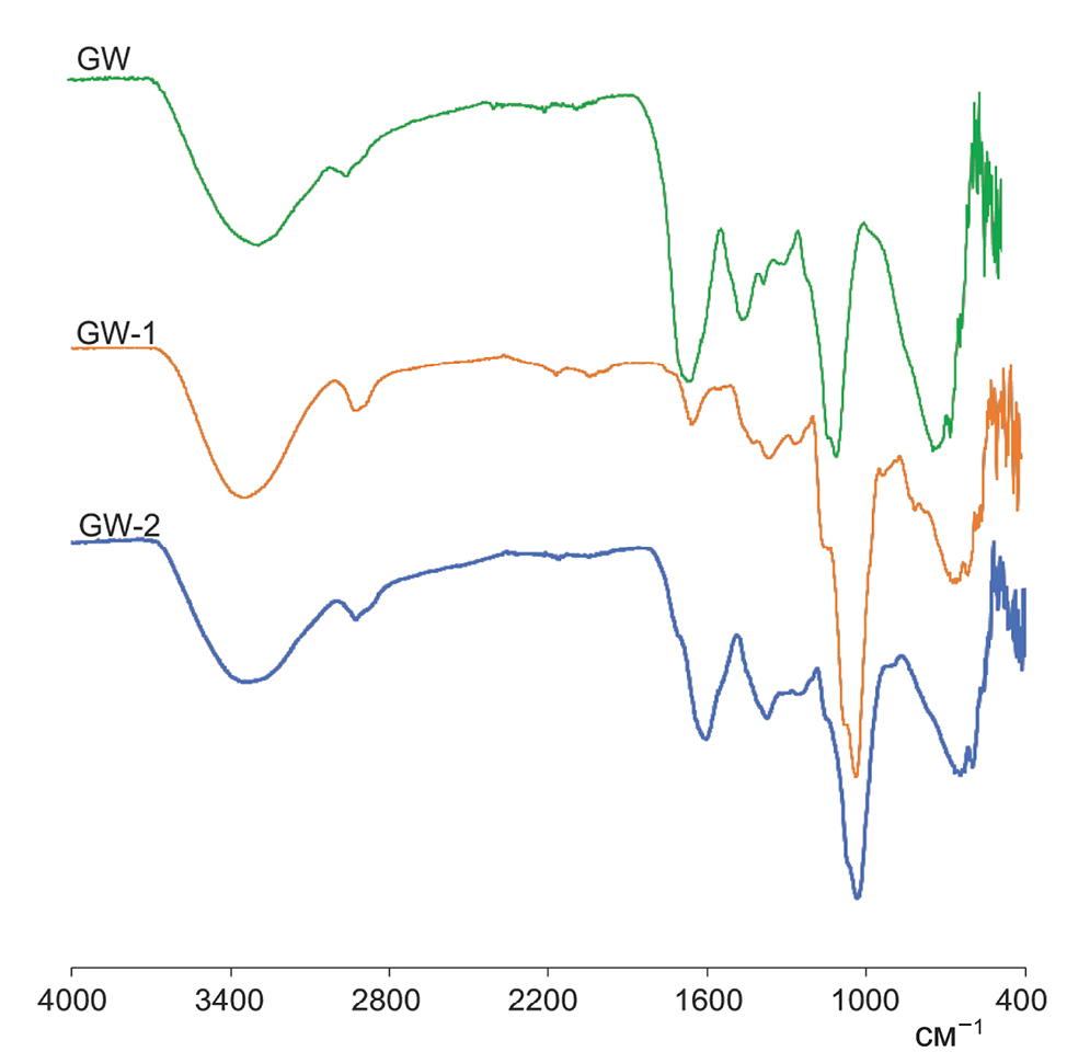 Рис. 4. ИК-спектры образцов неочищенных (GW) и очищенных (GW-1 и GW2) фракций полисахаридов из Ganoderma lucidum.