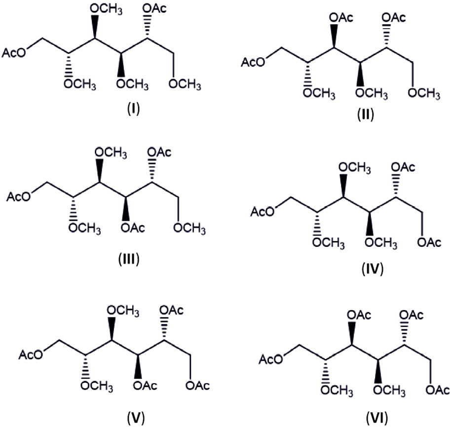 Рис. 5. Перметилированные альдитолацетали: 1,5-ди-O-ацетил-2,3,4,6-тетра-O-метил-глюцитол (I); 1,3,5-три-O-ацетил-2,4,6-три-O-метил-глюцитол (II); 1,4,5-три-O-ацетил-2,3,6-три-O-метил-глюцитол (III); 1,5,6-три-O-ацетил-2,3,4-три-O-метилглюцитол (IV); 1,4,5,6-тетра-O-ацетил-2,3-ди-O-метилглюцитол (V); 1,3,5,6-тетра-O-ацетил-2,4-ди-O-метил-глюцитол (VI).