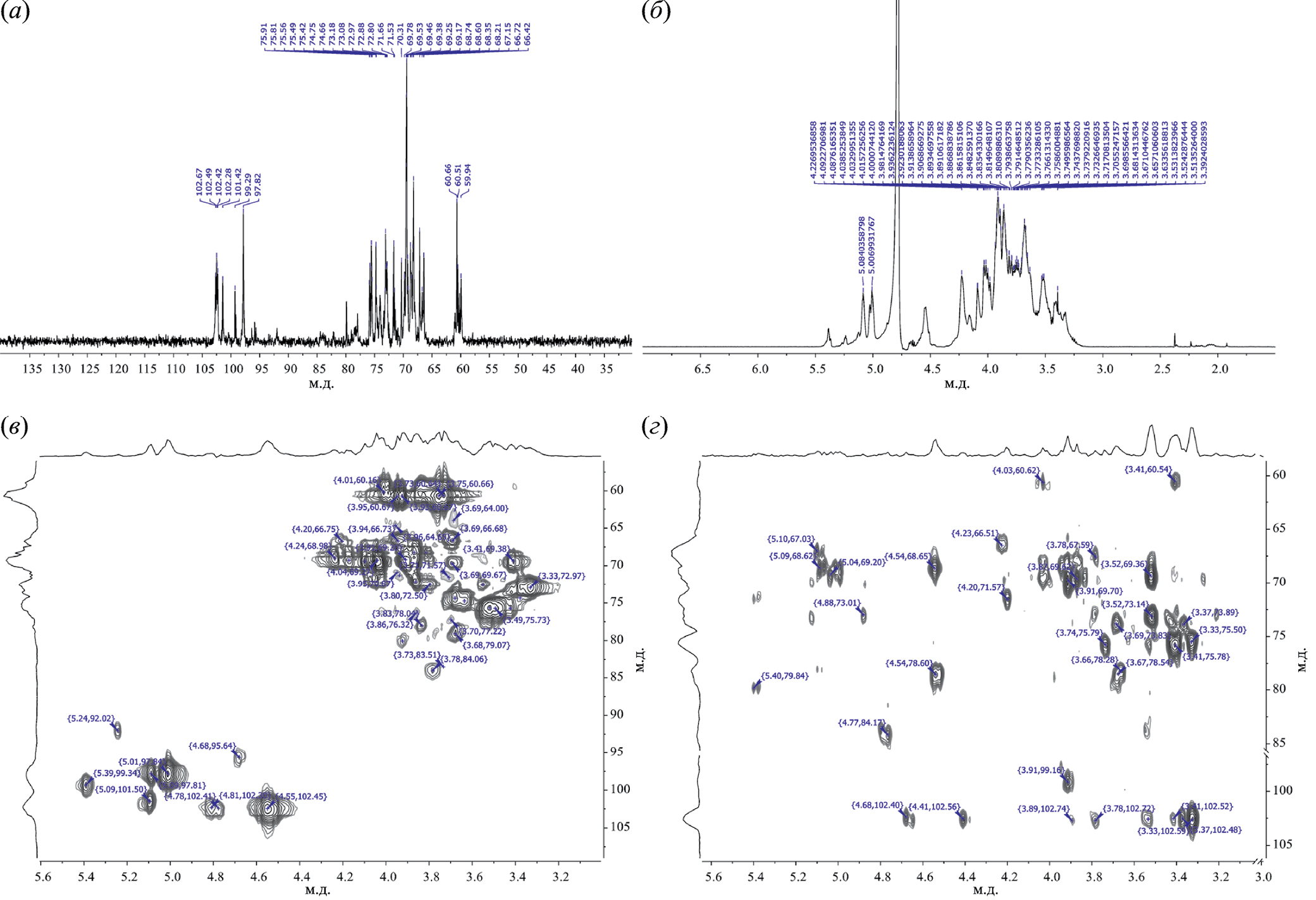 Рис. 6. Спектры 13C-ЯМР (a), 1H-ЯМР (б), HSQC (в) и HMBC (г) полисахарида GW-1.
