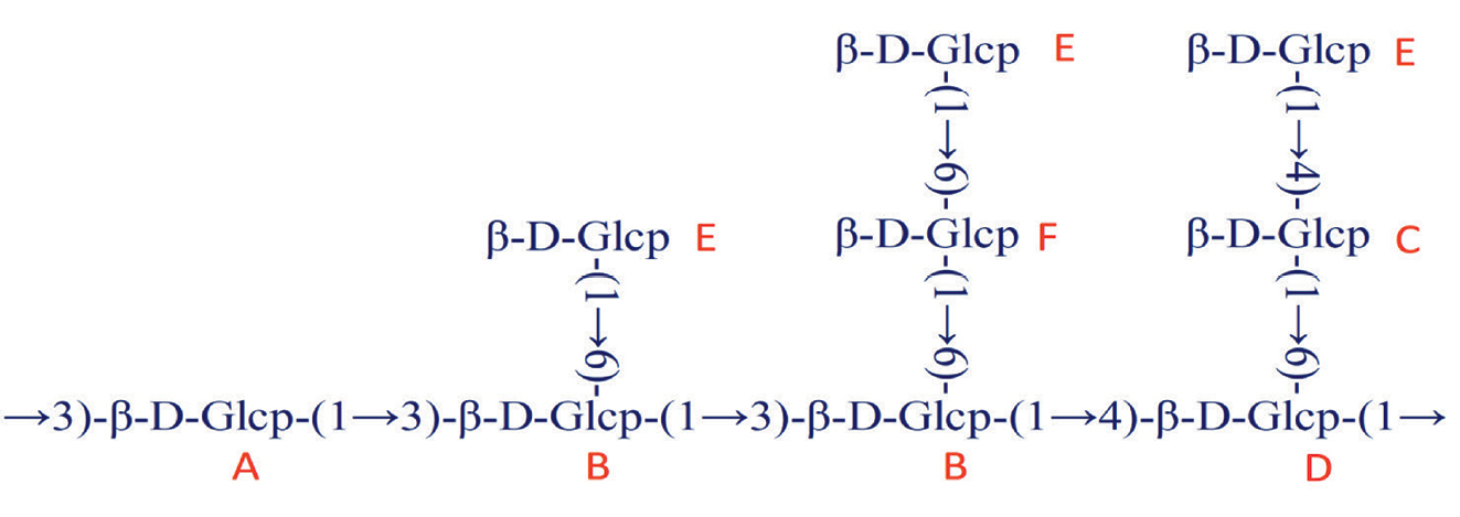 Спектроскопические исследования показали, что полисахариды содержат остатки 1,6-Glcp (остаток F), имеющие β-конфигурацию. В спектрах GW-1 специфические сигналы для 1,6-Glcp H1/C1, Н2/C2, C3/Н3, C4/Н4, H5/C5, H6/C6 обнаружены при 4.88/100.27, 3.80/72.50, 3.52/74.68, 3.69/69.67, 3.51/75.31, 3.87/68.26 м.д. соответственно. В исследованиях HMBC и NOESY кросс-пики показали, что остатки 1,6-Glcp в образцах GW-1, связаны с 1,3,6-Glcp- и концевыми 1-Glcp-остатками посредством β-(1,6)-гликозидных связей.
