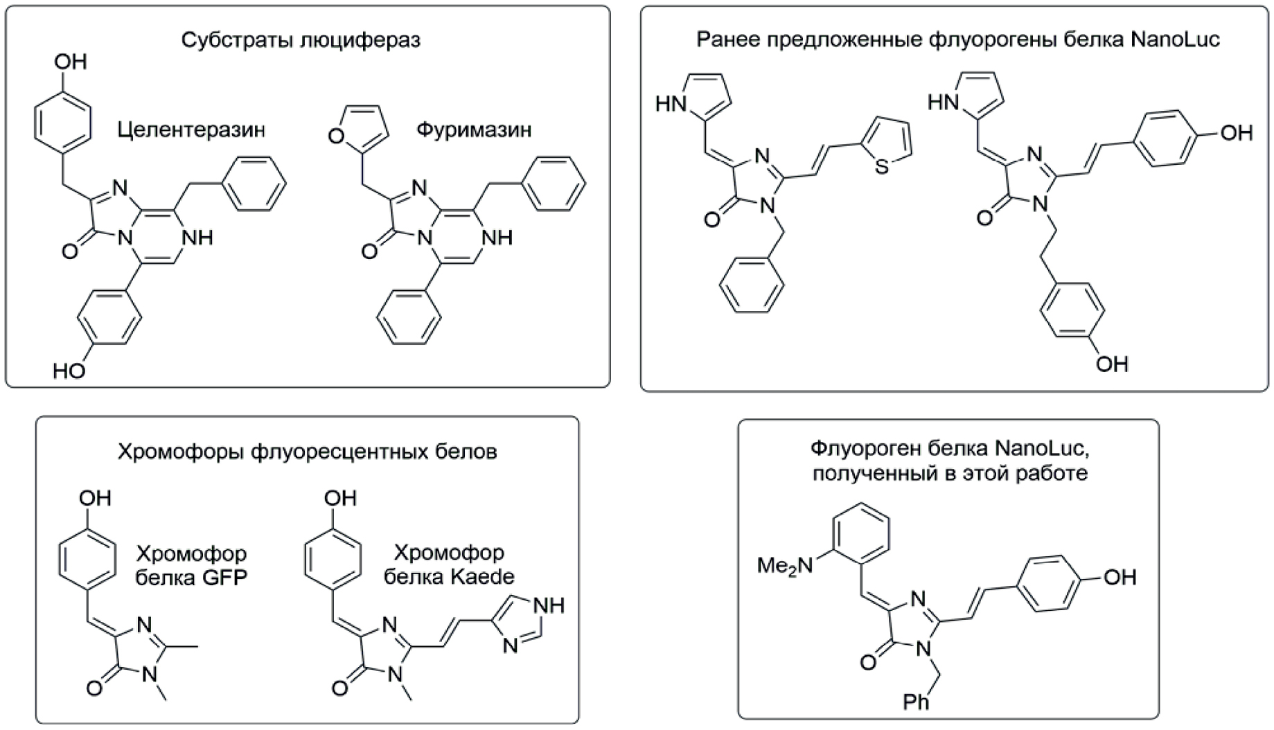 Схема 1. Структуры субстратов люцифераз, хромофоры флуоресцентных белков, ранее предложенные нами флуорогены для белка NanoLuc и флуороген для белка NanoLuc, полученный в этой работе.