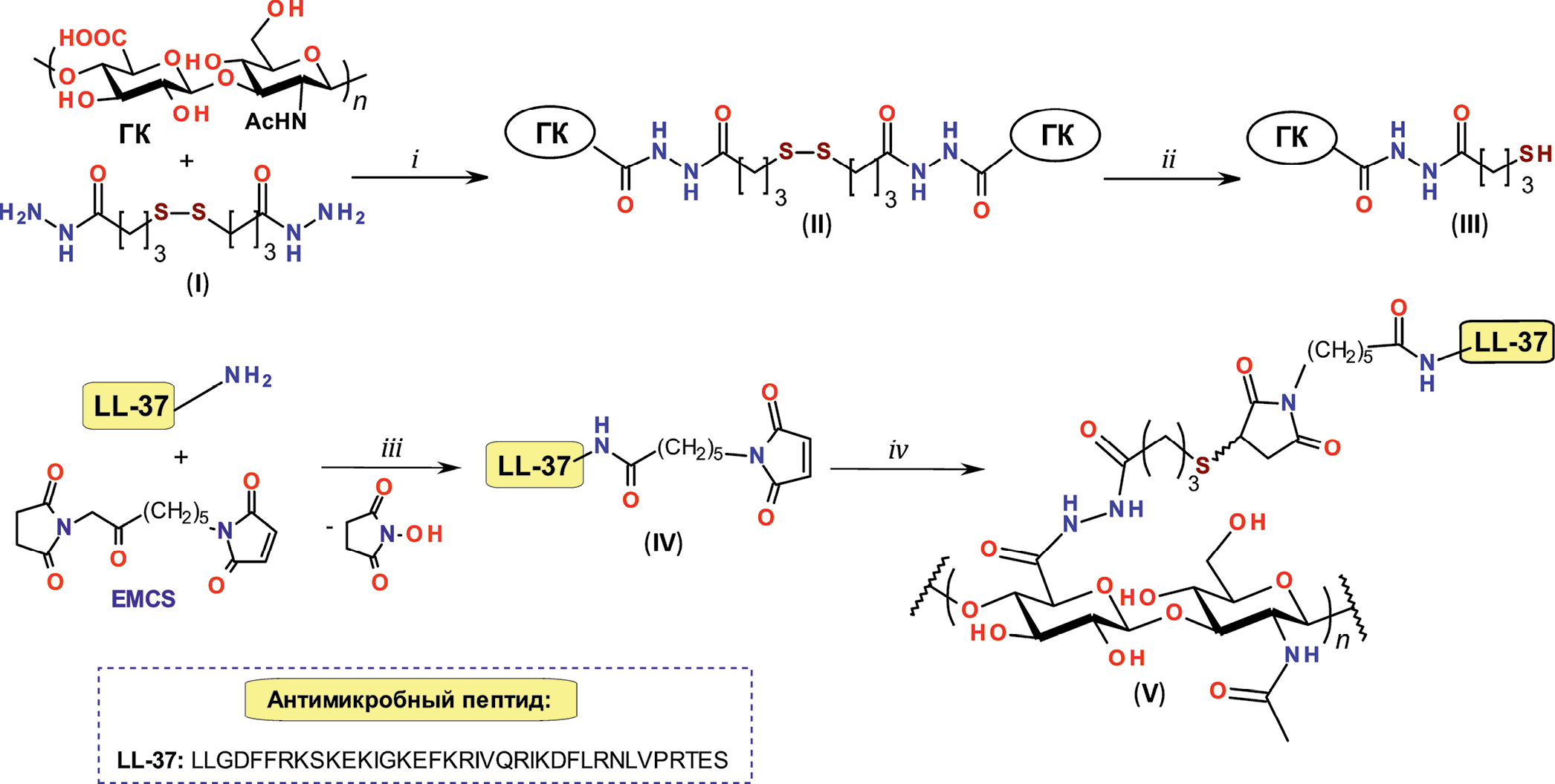 Схема 1. Синтез гибридной молекулы (V) на основе гиалуроновой кислоты и антимикробного пептида LL-37: i – EDC, H2O, pH 4.75, 18–20°С, 2 ч; ii – DTT, H2O, pH 7→8.5, 18–20°С, 24 ч; iii – ацетон–H2O, pH 7, 18–20°С, 2 ч; iv – ГК-SH (III), H2O, pH 4.75→7, 36–38°С, 2 ч.