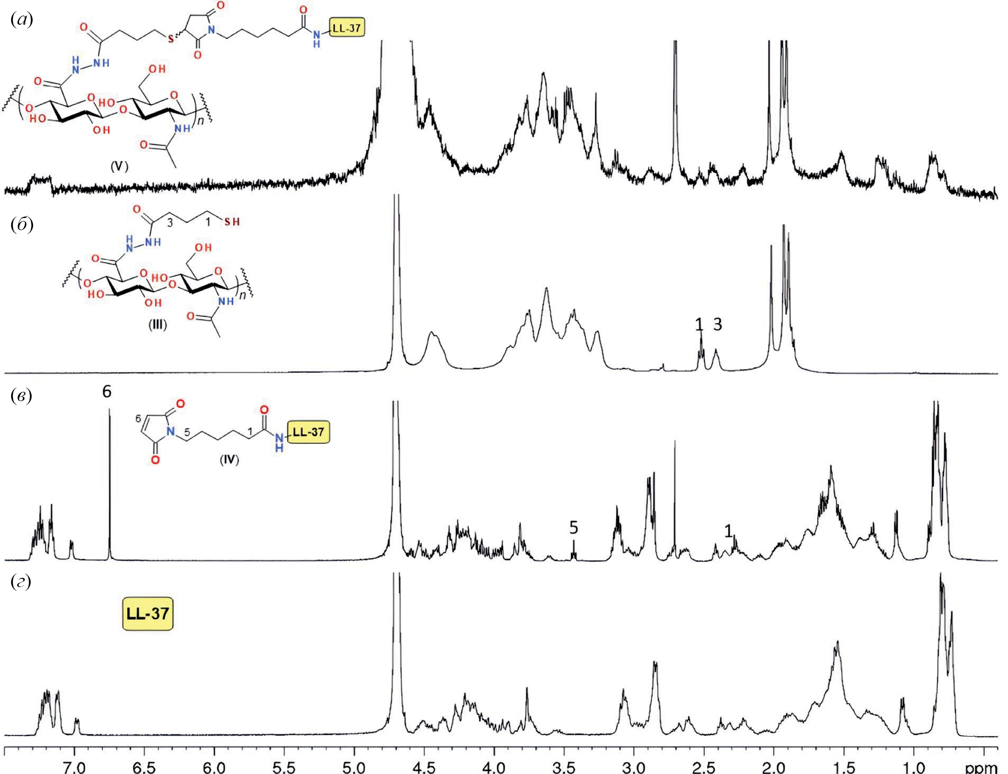 В спектре 1H-ЯМР гибридной молекулы (V) присутствовали уширенные сигналы, принадлежащие как полисахаридной части, так и олигопептидному фрагменту. При этом в спектре отсутствовал сигнал малеимидной группы при 6.75 м.д., что свидетельствует о полноте протекания реакции между соединениями (III) и (IV) (рис. 1).