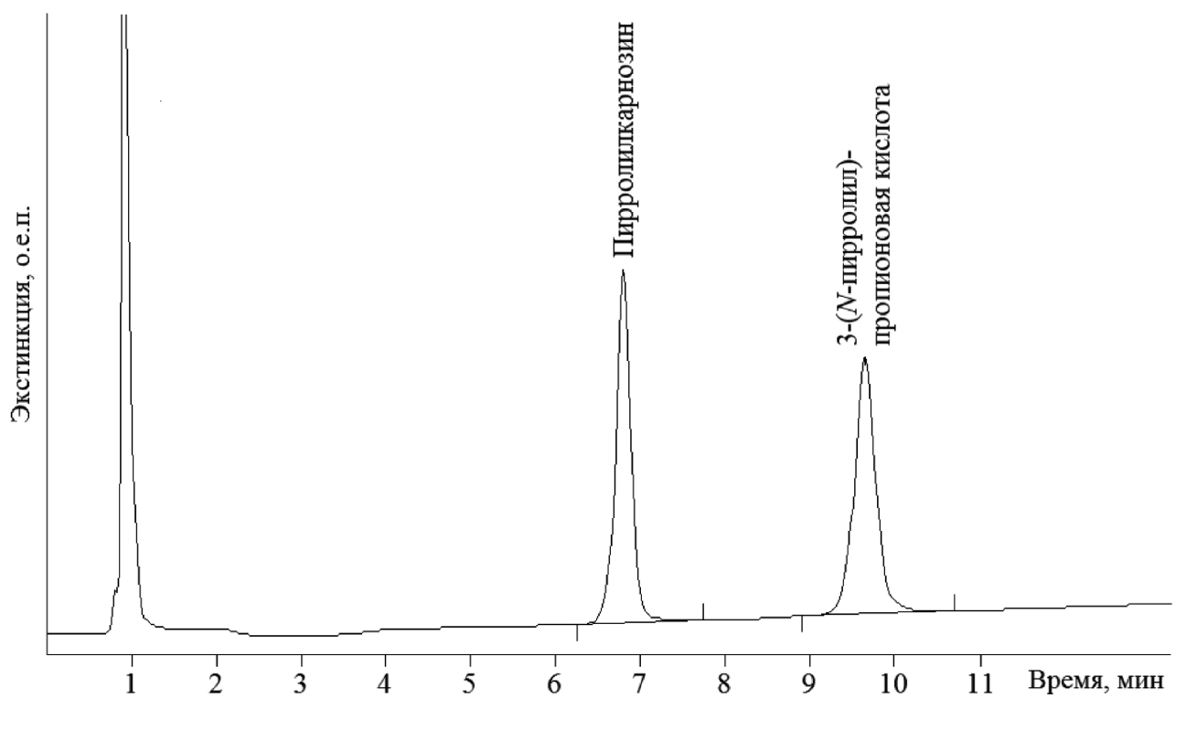 Ранее по методу Pegova et al. [9] была исследована устойчивость карнозина, ПК и СК к действию сывороточной карнозиназы. Показано, что ПК и СК более устойчивы к гидролизу по сравнению с карно- зином, который полностью деградирует в течение 3 ч. За это время содержание ПК и СК уменьшалось на несколько процентов [5, 6].