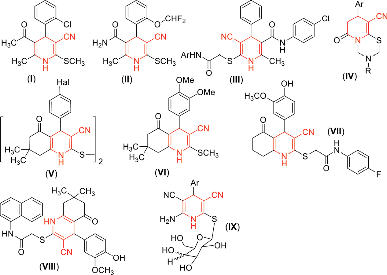 Известно, что производные 1,4-дигидро- и тетрагидроникотинонитрила обладают разнообразным биологическим действием. Так, 1,4-дигидропиридин-3-карбонитрилы (I, II) проявляют антиоксидантные и гепатопротекторные свойства [16, 17], соединения (III, IV) обладают противовирусной активностью [18] (рис. 1). Кроме того, у родственных пиридо- 1,3,5-тиадиазинов (4) выявлен аналептический эффект [19], показано противовоспалительное [20], адаптогенное [21] и анальгетическое действие [22]. Сообщается [23], что соединение (V) обладает противовирусным действием, соединения (VI, VII) – сильные анальгетики [22], а соединение (VIII) ингибирует аутотаксин [24]. 1,4-Дигидропиридин-3-карбонитрилы, конъюгированные с остатками α-D-глюко- или галактопиранозы (структура (IX)), рис. 1), оказывают выраженное противоопухолевое действие [25]. Ряд селенсодержащих частично насыщенных никотинонитрилов активен в отношении вируса клещевого энцефалита в микромолярных концентрациях in vitro [26]. В целом следует отметить высокий потенциал производных никотинонитрила для поиска новых биологически активных субстанций (обзорные работы [27–35]).