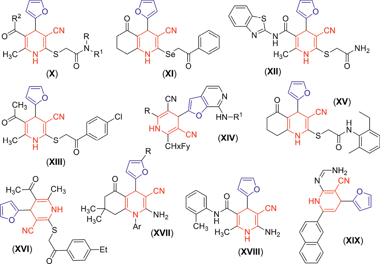 Из литературных данных известно, что гибридные молекулы общей структуры (X) (рис. 2), сочетающие 2-фурильный и 1,4-дигидроникотинонитрильный фрагменты, обладают активностью в отношении вируса омской геморрагической лихорадки [18], оказывают анальгетическое [38–43] и противовоспалительное [44] действие. Соединение (XI) [26, 45] проявляет умеренно выраженное противовирусное действие. По данным виртуального скрининга, соединение (XII) обладает сродством к аденозиновому рецептору A2A [46]. Дигидропиридин (XIII) – селективный модулятор глюкокортикоидных рецепторов с потенциальной противовоспалительной эффективностью [47]. Согласно патентным данным [48], cоединения (XIV) ингибируют тирозинкиназу c-Met. Соединение (XV) – сильный ингибитор ацетилхолинэстеразы, перспективный для терапии болезни Альцгеймера [49]. 1,4-Дигидроникотинонитрил (XVI) методом высокопроизводительного скрининга идентифицирован как ингибитор AmpC β-лактамазы [50]. 4-(2-Фурил)хинолины (XVII) в опытах in vitro показали незначительную противоопухолевую активность [51, 52], тогда как 4-(2-фурил)-1,4-дигидроникотинонитрилы (XVIII) [53] и (XIX) [54] проявили высокую цитотоксичность в отношении ряда линий раковых клеток. Данные о молекулярных гибридах, содержащих 2-фурильный и 1,4,5,6-тетрагидроникотинонитрильный фрагменты, менее многочисленны. Так, в литературе упоминается противовирусное [26] и анальгетическое [38, 41] действие таких соединений.