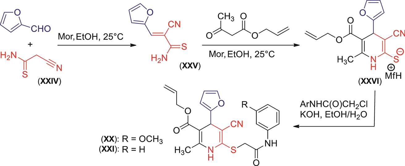 Синтез соединений (XX) и (XXI) осуществляли по схеме 1. Цианотиоацетамид (XXIV) реагировал с фурфуролом в присутствии каталитического количества морфолина (Mor); продукт конденсации Кнёвенагеля (XXV) вводили далее в реакцию in situ с аллилацетоацетатом и избытком морфолина. Полученный пиридин-2-тиолат (XXVI) подвергали S-алкилированию в присутствии щелочи соответствующими α-хлорацетанилидами.