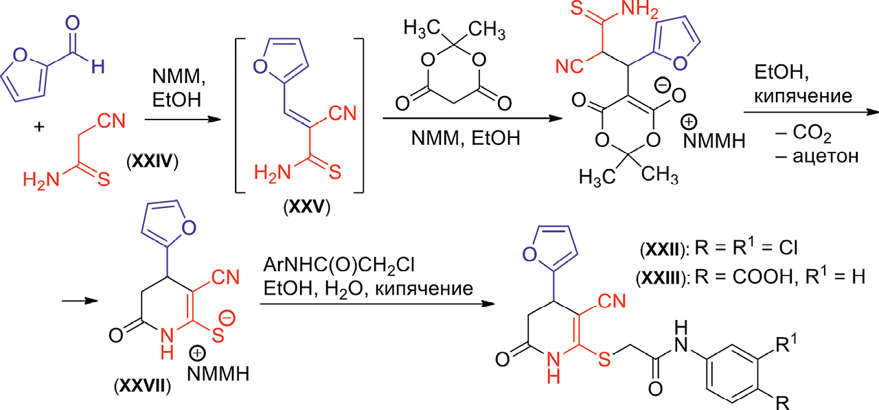 Соединения (XXII) и (XXIII) также были синтезированы из цианотиоацетамида (XXIV). Так, реакцией тиоамида (XXIV) с фурфуролом и кислотой Мельдрума в присутствии избытка N-метилморфолина (NMM) известным [38, 70–72] способом был получен 6-оксо-4-(2-фурил)-3-цианотетрагидро- пиридин-2-тиолат N-метилморфолиния (XXVII). Алкилированием тиолата (XXVII) замещенными α-хлорацетанилидами в водно-спиртовом растворе были получены целевые никотинонитрилы (XXII) и (XXIII) (схема 2).