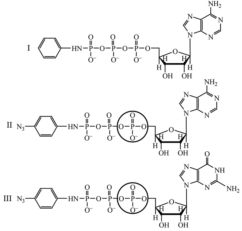 Рис 1. Субстраты РНК-полимеразы. I. γ-анилид аденозин трифосфата, II. γ-азидоанилид аденозин трифосфата, III γ-азидоанилид гуанозин трифосфата. Окружности обозначают α-P³² группу