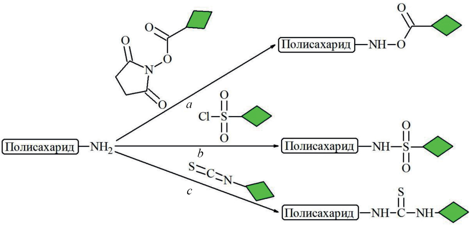 Таким методом получают, например, конъюгаты частично гидролизованного хитозана (с молекулярной массой ~5 кДа) и ультрафиолетового флуорофора ZW800-1 [73]. Эта метка вводится в фосфатном буфере (рН 8) при комнатной температуре в течение 6 ч.