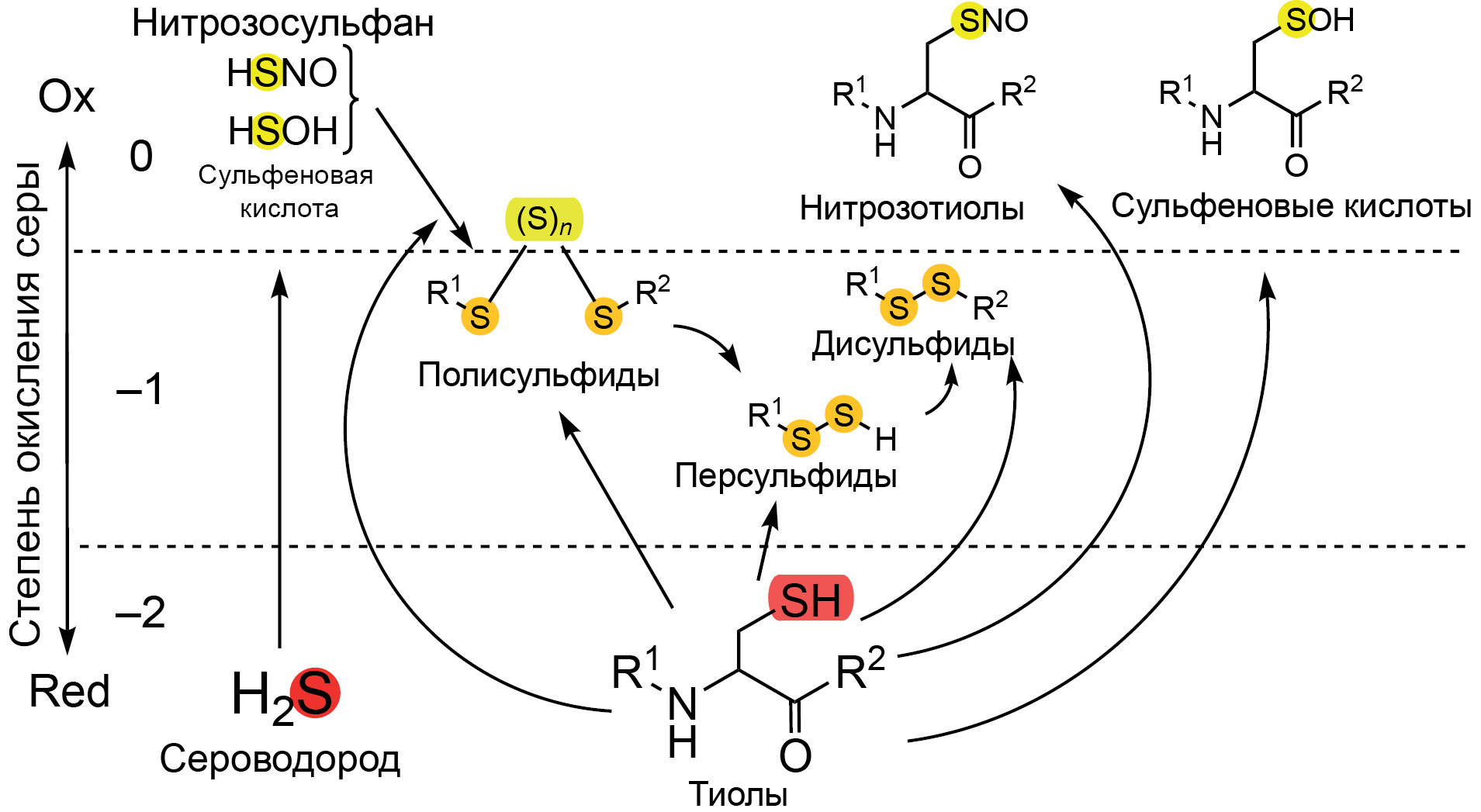 Около 20 лет назад исследователи внимательнее начали рассматривать биологическую роль активных формы серы (АФС): сероводорода (H₂S) и его производных, главные из которых – полисульфиды, персульфиды, нитрозотиолы (рис. 1). Для этого класса соединений была показана сигнальная функция внутри клетки, что обусловлено реакционной способностью с большим количеством внутриклеточных мишеней [1–3].