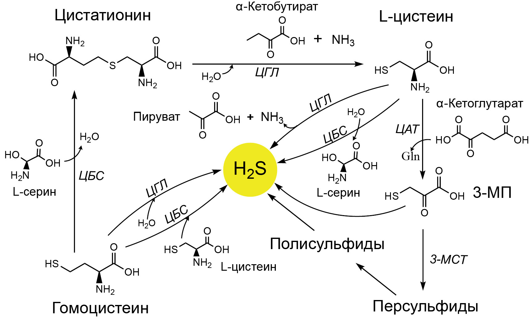 H₂S образуется в клетках человека и других млекопитающих благодаря работе нескольких ферментов, участвующих в метаболизме серосодержащих аминокислот: пиридоксаль-5-фосфат-зависимых цистатионин-β-синтазы (ЦБС, EC 4.2.1.22), цистатиониновой γ-лиазы/цистатионазы (ЦГЛ, EC 4.4.1.1) и пиридоксаль-независимой 3-меркаптопируватсульфотрансферазы (3-МСТ, EC 2.8.1.2) (рис. 2). Данные ферменты имеют различные профили тканевой экспрессии, отличаются по эффективности синтеза H₂S, субстратной специфичности и механизмам регуляции активности, что в совокупности позволяет тонко контролировать уровни внутриклеточного H₂S [32].