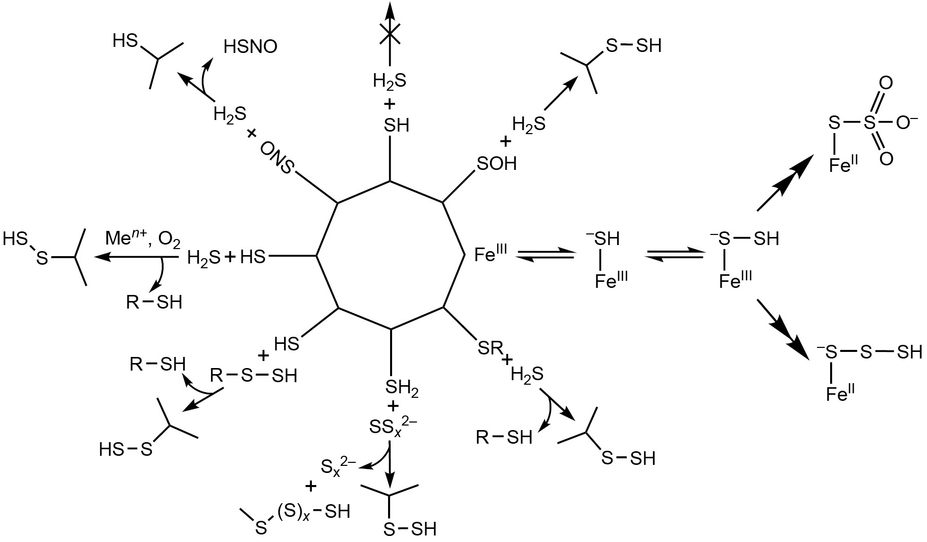 Основные реакции H₂S с биомолекулами – связывание и/или редокс-реакции с металлсодержащими центрами, перекрестный сигналинг с активными формами кислорода (АФК) и активными формами азота (АФА), а также редокс-реакции с клеточными производными цистеинов с образованием персульфидов.