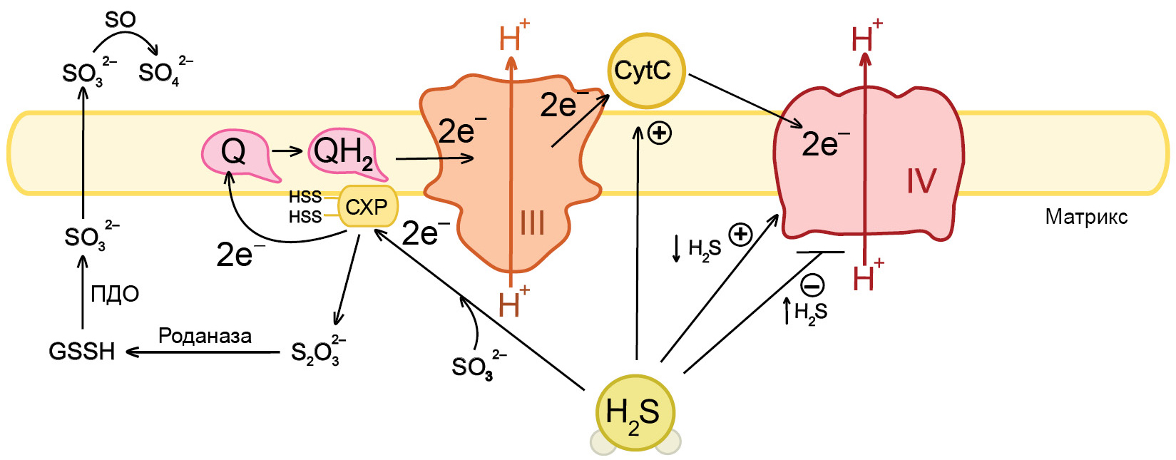 Для избавления от избытков H₂S и биосинтеза окисленных форм серы существуют внутриклеточные ферментативные системы катаболизма H₂S, из них основной – митохондриальный путь окисления H₂S (рис. 4). Первую реакцию, в которой происходит двухэлектронное окисление H₂S до тиосульфата или персульфида глутатиона (GSSH) в зависимости от акцептора (сульфит или глутатион (GSH)) и восстановление убихинона до убихинола, катализирует фермент внутренней митохондриальной мембраны – сульфохинонредуктаза (СХР, EC 1.8.5.4) [50]. Электроны при этом поступают в ЭТЦ, таким образом, сульфид – первый открытый неорганический донор электронов в дыхательной цепи млекопитающих [50]. Далее, если продуктом реакции является тиосульфат, он вступает в роданазную реакцию и образует GSSH. Затем так или иначе образованный GSSH окисляется персульфиддиоксигеназой (ПДО, EC 1.13.11.18) до сульфит-иона и GSH; сульфит-ион затем окисляется до сульфата сульфитоксидазой (СО, EC 1.8.3.1) [51].