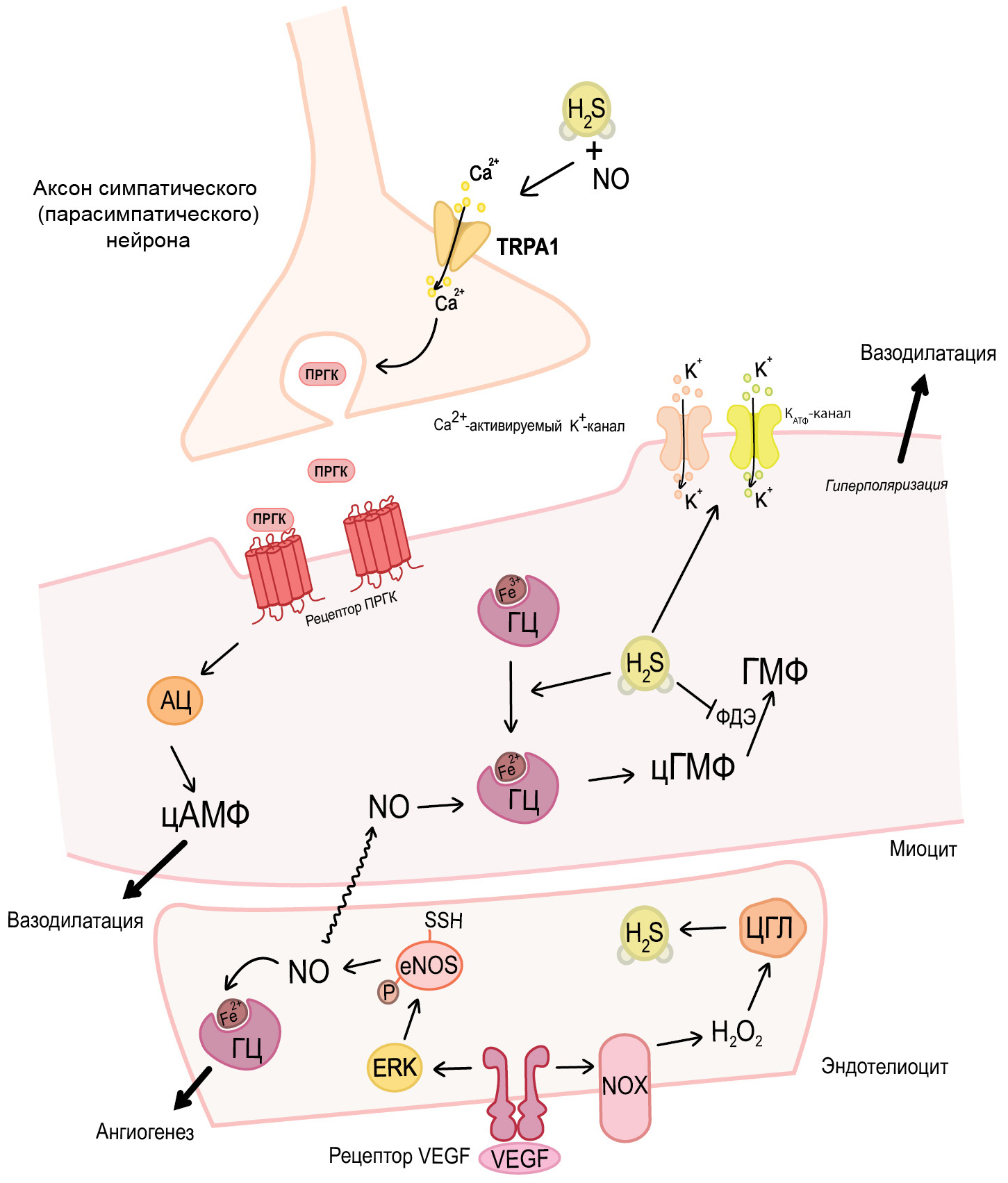 К настоящему моменту установлено, что АФС оказывают влияние на сердечно-сосудистую систему, в частности снижают повреждающее действие ишемии-реперфузии на миокард, стимулируют ангиогенез, вызывают расслабление гладкой мускулатуры и участвуют в регуляции артериального давления [10]. Одна из первых обнаруженных биологических активностей H₂S – вазодилатация [7], поэтому влияние H₂S на состояние сосудов представляет собой важный фактор при исследовании механизмов развития таких патологических состояний, как артериальная гипертензия и ишемия-реперфузия. Данное свойство H₂S применяют при создании препаратов для лечения гипертонии, для этого разрабатываются доноры H₂S в качестве антигипертензивных препаратов [4]. Однако механизм H₂S-опосредованной дилатации еще не до конца изучен. Известно, что H₂S стимулирует вазодилатацию посредством активации АТФ-зависимого калиевого канала в результате персульфидации, что приводит к гиперполяризации гладкомышечных клеток в стенках сосудов [70]. Воздействие на Ca2+-зависимые К+-каналы, наоборот, вызывает их блокирование, что, вероятно, ввиду различной концентрационной зависимости и степени представленности не приводит к вазоконстрикции [71]. При этом действие H₂S происходит синергично с ∙NO. Поэтому имеет место либо непосредственное взаимодействие H₂S и ∙NO, либо с ферментами синтеза ∙NO. Совместное действие H₂S и ∙NO связано также с образованием нитрозотиолов в нейронах, регулирующих тонус сосуда [72]. Нитрозотиолы активируют TRPA-каналы и повышают концентрацию кальция внутри нейрона. В результате происходит экзоцитоз везикул с кальцитонин-ген-родственным пептидом (ПРГК), который, в свою очередь, активирует рецептор, ассоциированный с G-белком, на гладкомышечной клетке в стенке сосуда [73]. Это событие способствует активации аденилатциклазы, синтезу цАМФ и активации протеинкиназы А. Протеинкиназа А потенциально способна повышать активность эндотелиальной ∙NO-синтазы [73]. Персульфидация цистеина в положении 443 ∙NO-синтазы повышает активность фермента, что приводит к увеличенной продукции ∙NO и, в свою очередь, к активации растворимой гуанилатциклазы. При этом известно, что H₂S усиливает связывание ∙NO гуанилатциклазой [74]. Синтез цГМФ активируется, а его распад подавляется в результате связывания H₂S c ионами Zn2+ в составе фосфодиэстеразы. Описываемые эффекты приводят к вазодилатации (рис. 5) [75].