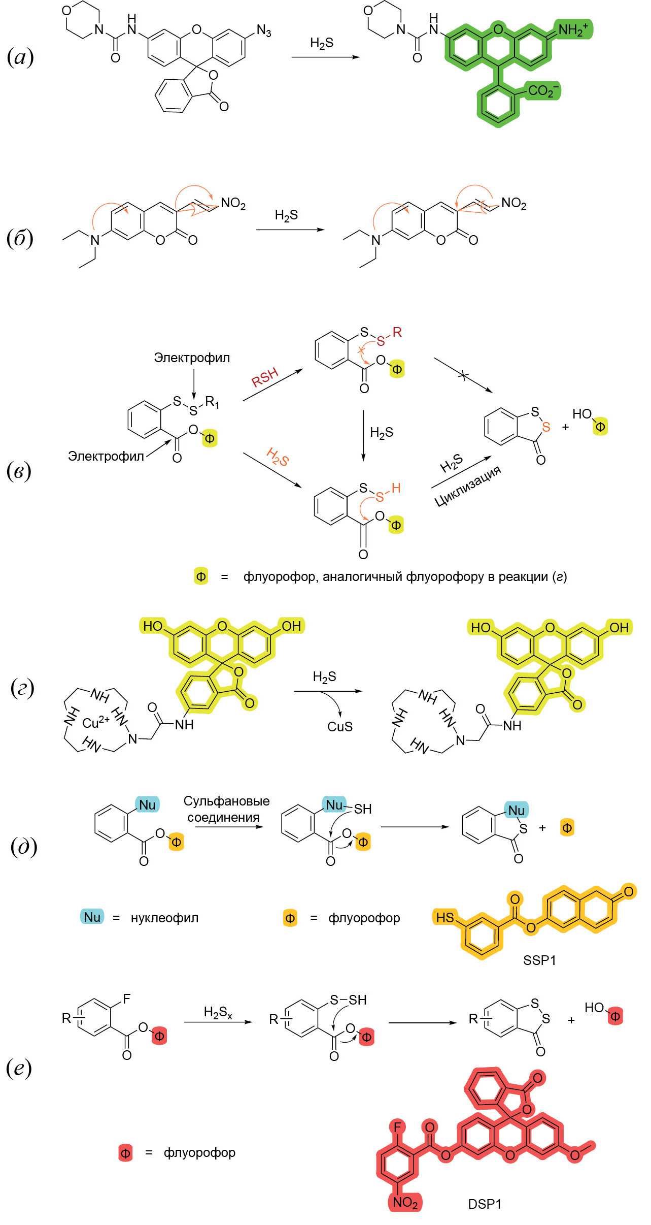 Зонды для детекции сульфановых соединений основаны на реакциях либо нуклеофильных (рис. 7д), либо электрофильных (рис. 7е) групп красителя с аналитом с образованием ковалентных аддуктов и последующим усилением флуоресценции за счет высвобождения флуорофорной части или, наоборот, за счет ослабления тушения [127–129].