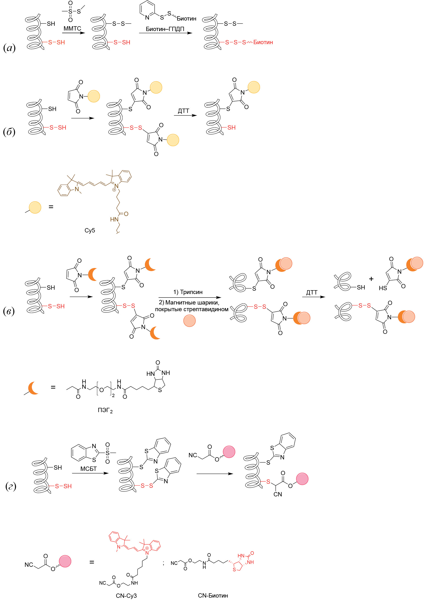 Простой в использовании метод – обработка образца флуоресцентным производным N-этилмалеимида (NEM-Cy5), алкилирующим как остатки цистеина, так и его персульфидированные модификации [14]. После обработки восстанавливающим агентом (ДТТ) флуоресценция персульфидированных белков снижается из-за диссоциации флуоресцентной метки, что можно детектировать в параллельных электрофоретических разделениях (рис. 8б). Стоит заметить, что для NEM показана способность реагировать с аминогруппами [152], что снижает селективность данного метода. Для оптимизации такого подхода с целью получения более высокого разрешения применяют биотин-конъюгированные производные NEM, которые позволяют после трипсинолиза провести очистку полученных пептидов, содержащих персульфидированные остатки цистеина, с последующим анализом методами ВЭЖХ-МС (рис. 8в) [24, 153]. Модификации данной методики в совокупности с использованием изотопных меток позволяют проводить количественные протеомные исследования, однако анализ может быть затруднен из-за перекрестной реактивности производных NEM с остатками сульфеновых кислот цистеина [154]. Проблема, связанная с занижением оценок уровней модифицированных остатков для рассмотренного выше метода, может быть решена в подходах, в которых сорбция осуществляется только для персульфидированных остатков. В одной из методик было предложено применение метилсульфонилбензотиазола (МСБТ) в качестве блокирующего агента, модифицирующего как тиоловые, так и персульфидные группы. Однако аддукт персульфида и МСБТ с повышенной электрофильностью на следующей стадии методики становится мишенью либо флуоресцентных (CN-Cy3), либо биотинилированных производных (CN-биотин) цианоуксусной кислоты (рис. 8г), для последних в дальнейшем производится аффинная очистка с дальнейшим масс-спектрометрическим анализом [57]. Недостатки данного подхода – низкая растворимость производных МСБТ в водных растворах и низкая стабильность цианоацетатных аддуктов при МС-анализе [24, 153]. Авторами данной методики был предложен ряд изменений, облегчающих процедуру эксперимента за счет использования коммерчески более доступных и более селективных в отношении персульфидов реагентов [77].