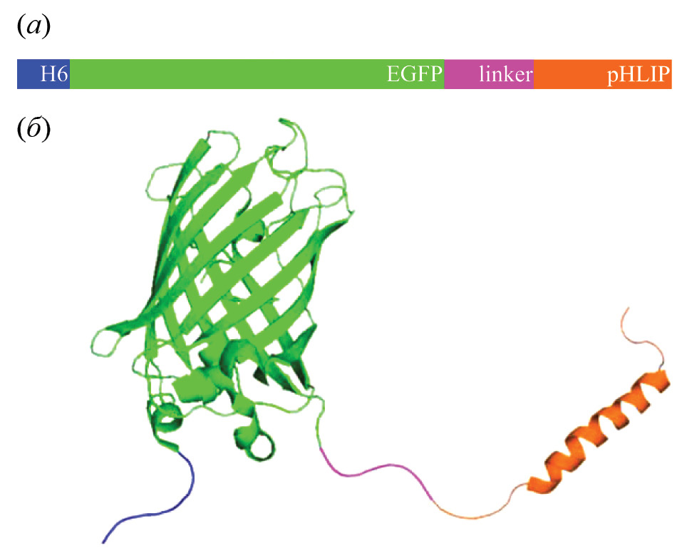 Дизайн и наработка конструкций EGFP/ pHLIP. Для более подробного изучения возможности применения pHLIP-технологии для доставки к раковым клеткам высокомолекулярных соединений были получены гибридные конструкции, состоящие из пептидов pHLIP и белкового компонента. Последний был представлен флуоресцентным белком EGFP, выполняющим роль как модельного груза, переносимого при помощи pHLIP, так и флуоресцентной метки, обладающей высокой яркостью (рис. 1).