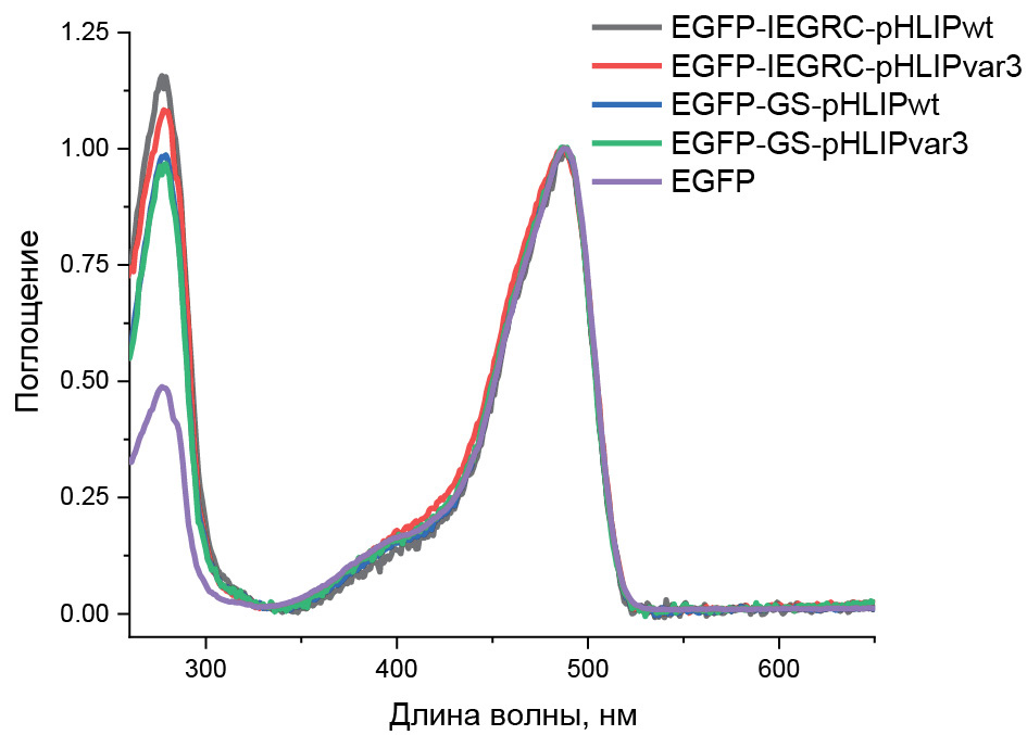 Мы изучили влияние пептидов pHLIP на синтез хромофора EGFP в составе гибридных структур. Для этого регистрировали спектры поглощения каждой конструкции (рис. 2) и определяли общую концентрацию белково-пептидных конструкций при 280 нм и концентрации конструкций с полностью созревшим хромофором по поглощению при 488 нм. Степень созревания хромофора определяли отношением значений концентрации конструкций с полностью созревшим хромофором к общей концентрации. В контрольном белке EGFP степень созревания хромофора составила ~77% (табл. 1). В случае белково-пептидных конструкций, содержащих GS-линкер, хромофор синтезировался примерно на 20% хуже относительно контроля, а в конструкциях с линкером IEGRCGS – примерно на 30%.