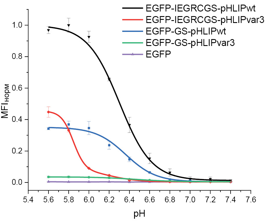 Проточная цитофлуориметрия. Клетки HeLa выращивали в культуральных флаконах Т-25 до конфлюэнтности ~90% (~2 млн клеток на флакон). Затем среду удаляли, добавляли 1 мл раствора Версена и инкубировали клетки при 37°С во влажной атмосфере с 5% CO2. После 10 мин инкубации клетки ресуспендировали до получения гомогенной суспензии и центрифугировали 3 мин при 125 g. Супернатант удаляли, клетки ресуспендировали в 600 мкл PBS с добавлением FBS до 10%. Образцы для исследования готовили при помощи смешивания 3 мкл полученной клеточной суспензии с 97 мкл буферного раствора желаемого pH (диапазон значений рН 5.6–7.4 с шагом 0.2 единицы), содержащего 50 мМ фосфата, 100 мМ NaCl, 10% FBS и гибридный или контрольный белок в концентрации 1 мкМ. Полученную смесь инкубировали 15 мин при 37°С, затем клетки осаждали центрифугированием 30 с при 1000 g, супернатант удаляли, добавляли 100 мл PBS и проводили анализ методом проточной цитофлуориметрии с использованием Novocyte 3000 VYB (ACEA Biosciences, США). Обработку полученных данных проводили при помощи программного обеспечения NovoExpress 1.3 (ACEA Biosciences Inc., США). Количество клеток было подобрано так, что после тестирования образца получалось ~20 000 событий. Сначала отбирали события по параметрам FSC-A/SSC-A, а затем по FSC-A/FSC-H, получали гистограммы интенсивности флуоресценции клеток. Для регистрации флуоресценции использовали канал BL1 (лазер возбуждения 488 нм, эмиссионный фильтр 530/30 нм). Для оценки эффективности связывания гибридных белково-пептидных конструкций с клетками использовали отношение значения медианы интенсивности флуоресценции (MFI) к эффективности созревания хромофора EGFP. Для каждой белково-пептидной конструкции анализ проводили в трех повторах. Полученные зависимости MFI от pH аппроксимировали с помощью программы Origin 2021 (OriginLab, США) функцией