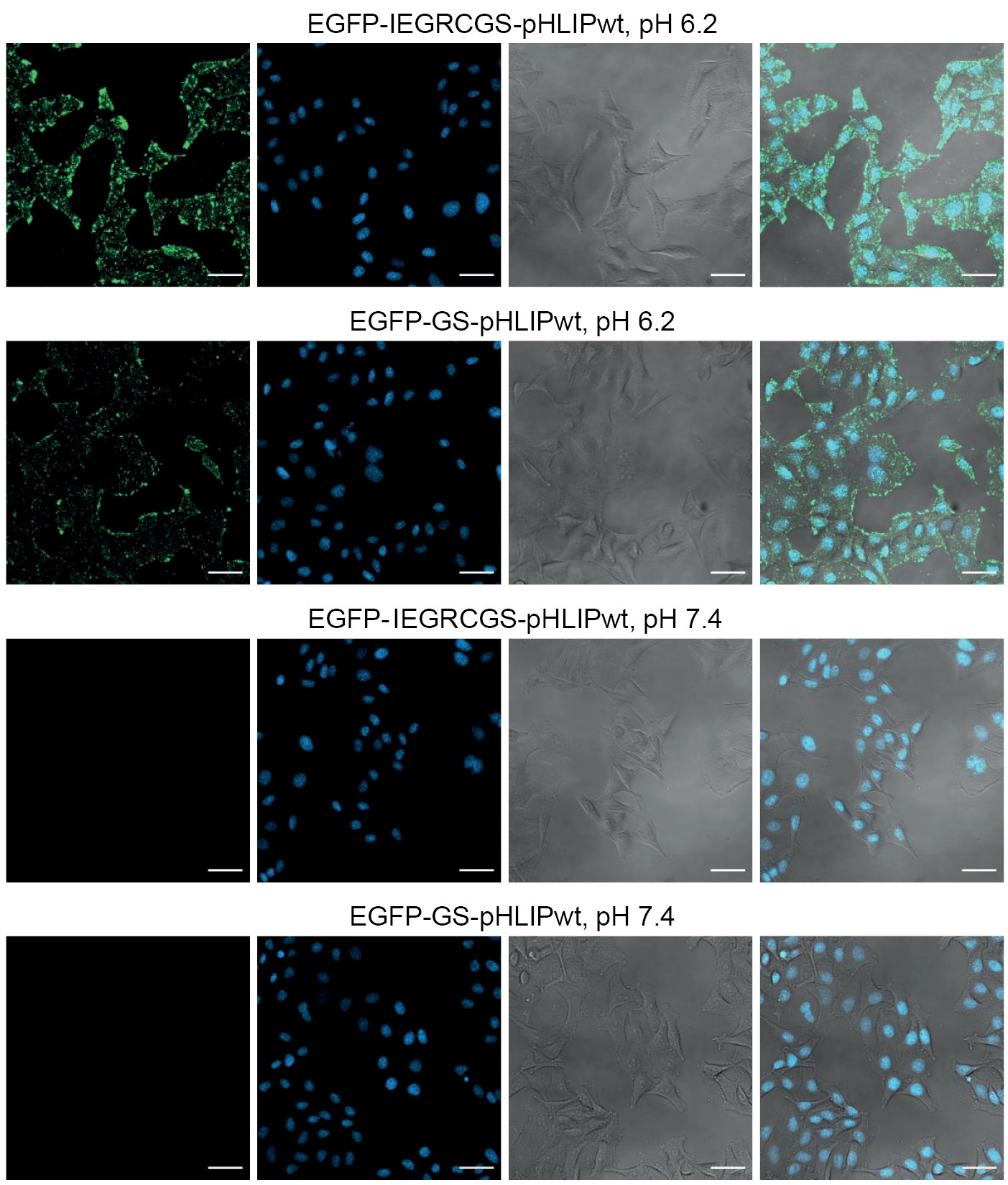 Согласно полученным данным, обе конструкции связывались с мембранами клеток при рН 6.2, однако уровень зеленого флуоресцентного сигнала был выше в случае обработки клеток EGFP-IEGRCGS-pHLIPwt (рис. 4).