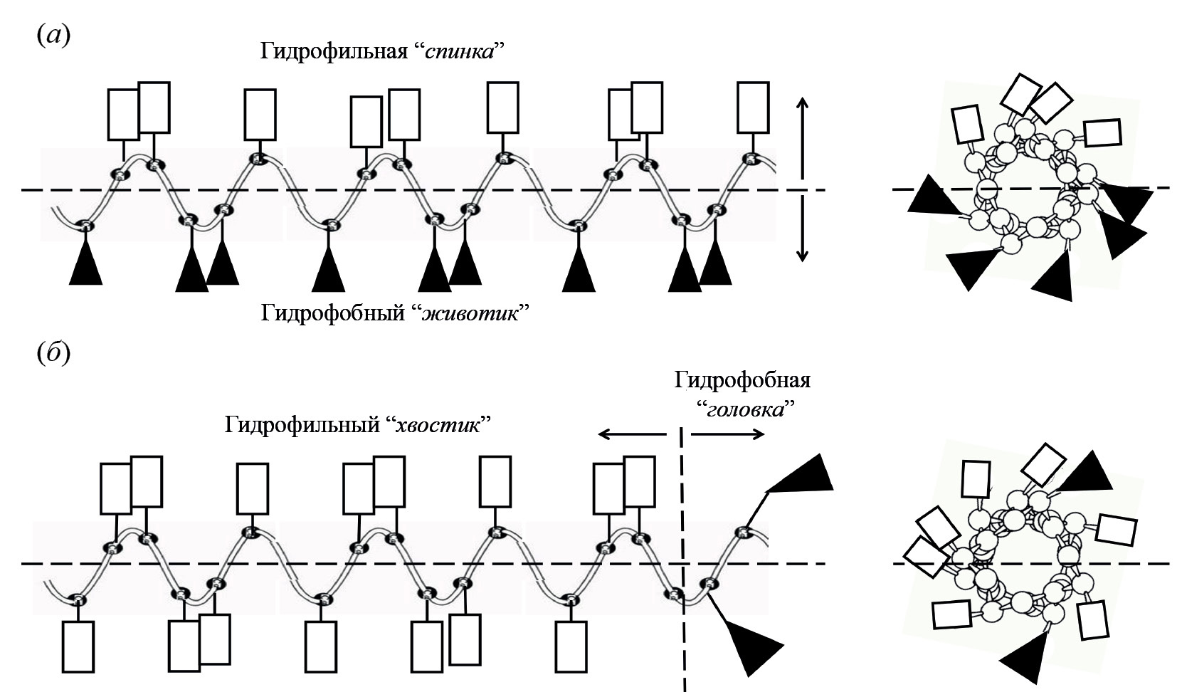 Рис. 1. Гипотетическое представление классического “кругового” (а) и “линейного” (б) типов амфипатичности α-спиральных пептидов. Прямоугольниками обозначены гидрофильные или катионные остатки аминокислот, треугольниками – гидрофобные остатки. В случае классического “кругового” типа амфипатичности (КТА) [6, 22, 23] гидрофобные и гидрофильные полярные поверхности α-спиральной молекулы пептида разделены продольной осевой линией (а). На рисунке верхняя поверхность гидрофильная, нижняя – гидрофобная (амфипатичность по типу “спинка–животик”). В случае линейного типа амфипатичности (ЛТА) гидрофобные и гидрофильные (катионные) остатки аминокислот разнесены на противоположных концах вдоль линейной оси пептида. Гидрофобная и гидрофильная полярные области в этом случае разделены поперечной линией, перпендикулярной продольной оси пептида (б), где один (левый) конец молекулы имеет гидрофильный “хвостик”, а противоположный (правый) – гидрофобную “головку”. Справа представлены двумерные проекции “спиральных колес” Шиффер и Эдмундсона [20, 24] этих же пептидов. Видно, что полярная однородность гидрофобных и гидрофильных групп в случае “линейного” типа амфипатичности (б) в проекции, представленной слева, гораздо выше, чем когда та же молекула представлена в классическом виде в виде двумерных проекций “спиральных колес” (справа).