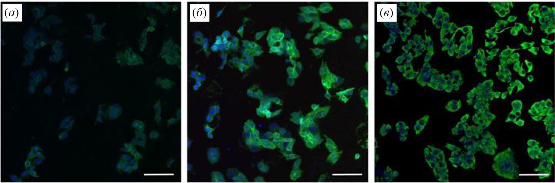 Рис. 1. Влияние соединения (VIIa) на индукцию ферроптоза в клетках НСТ-116: (a) – контроль – рост клеток с 5% DMSO; (б) – рост клеток с 1/3 IС50 эрастина; (в) – рост клеток с 1/3 IС50 соединения (VIIa). Масштабный отрезок – 100 мкм.