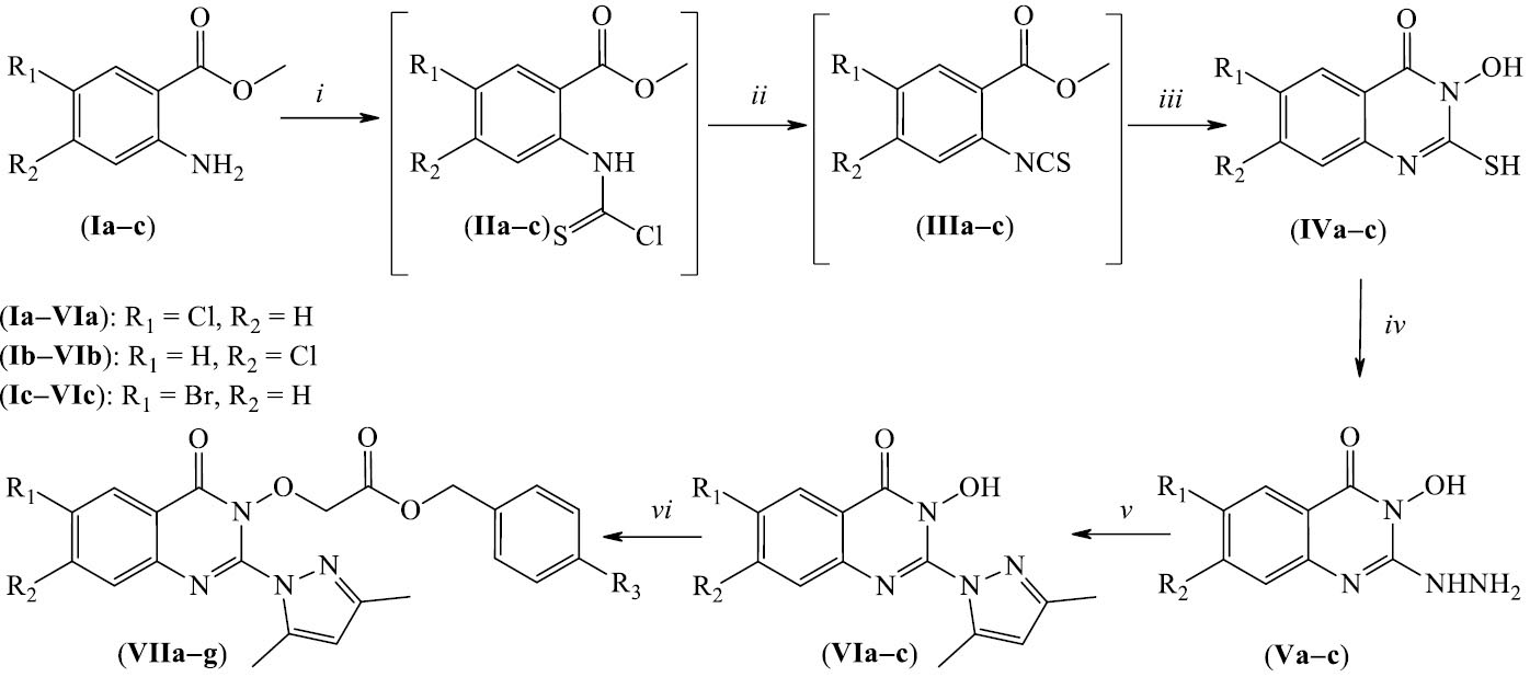 Далее нагреванием полученных соединений с избытком гидразингидрата в этаноле получали соединения (Va–d), которые конденсировали с ацетилацетоном, получая соединения (VIa–d). Целевые соединения (VIIa–g) получали алкилированием различными бензиловыми эфирами хлоруксусной кислоты соединений (VIa–d).