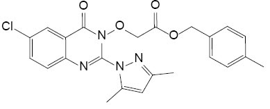 4-Метилбензил 2-((2-(3,5-диметокси-1H-пиразол-1-ил)-7-хлор-4-оксохиназолин-3(4H)-ил)окси)ацетат (VIIc). Выход 125 г (55.2%), белые кристаллы, т. пл. 91–92°С. Спектр 1H-ЯМР (DMSO-d6): 8.17 (д, J 8.6, 1H), 7.79 (д, J 2.0, 1H), 7.64 (дд, J 8.6, J 2.0, 1H), 7.30–7.13 (м, 4H), 6.16 (д, J 1.0, 1H), 5.13 (д, J 2.0, 4H), 2.42 (д, J 0.9, 3H), 2.30 (с, 3H), 2.10 (с, 3H). Спектр 13C-ЯМР (CDCl3): 166.68, 158.74, 151.90, 146.07, 144.12, 143.71, 141.53, 138.62, 132.29, 129.47, 128.75, 128.66, 128.27, 127.52, 120.89, 108.92, 74.05, 67.04, 21.40, 13.68, 12.36. HRMS: m/z 453.1332 [M]+. Вычислено для (C23H22ClN4O4)+: 453.1328.