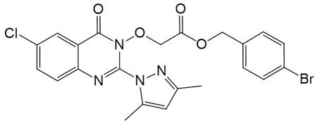 4-Бромбензил 2-((2-(3,5-диметокси-1H-пиразол-1-ил)-6-хлор-4-оксохиназолин-3(4H)-ил)окси)ацетат (VIIg). Выход 150 мг (57.9%), белые кристаллы, т. пл. 126–127°С. Спектр 1H-ЯМР (DMSO-d6): 8.14 (д, J 2.5, 1H), 7.93 (дд, J 8.7, J 2.5, 1H), 7.74 (д, J 8.7, 1H), 7.64–7.41 (м, 2H), 7.41–7.23 (м, 2H), 6.16 (с, 1H), 5.17 (с, 2H), 5.15 (с, 2H), 2.42 (с, 3H), 2.10 (с, 3H). Спектр 13C-ЯМР (CDCl3): 166.51, 158.29, 151.84, 143.72, 135.68, 134.31, 133.85, 131.99, 130.23, 129.61, 126.64, 123.57, 122.84, 108.80, 74.03, 66.25, 13.65, 12.29. HRMS: m/z 517.0281 [M]+. Вычислено для (C22H19BrClN4O4)+: 517.0277.