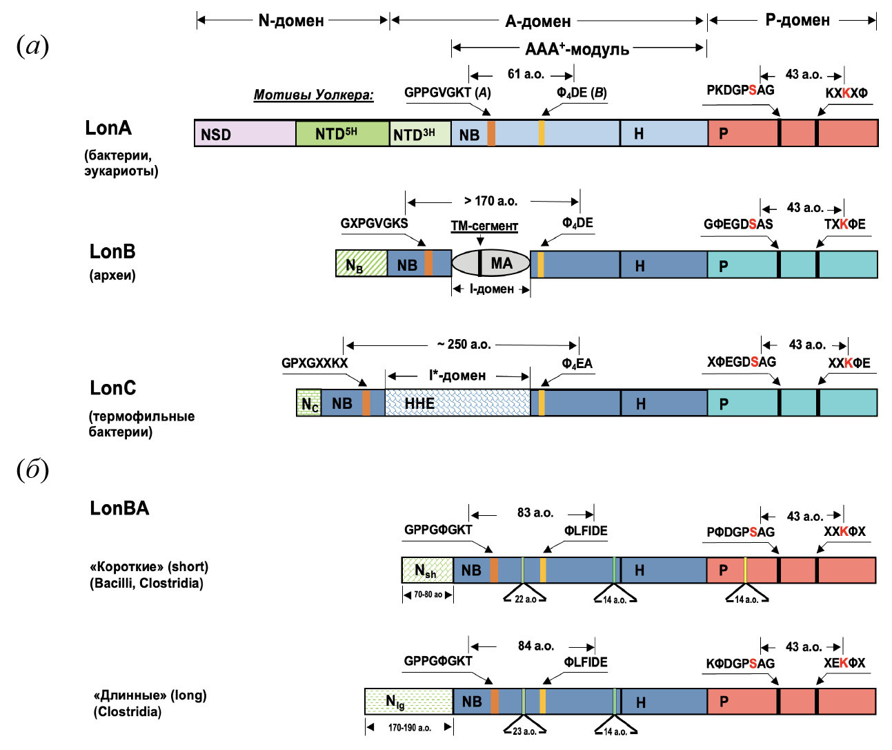 Рис. 1. Доменная организация и консенсусные элементы активных центров Lon-протеаз различных подсемейств. (а) – Lon-протеазы подсемейств А, В и С; (б) – Lon-протеазы подсемейства ВА. Субдомены NSD, NTD5H и NTD3H формируют N-концевую область LonA-протеаз. NB, NC, Nsh и Nlg – N-концевые фрагменты ферментов подсемейств В, С и ВА. Нуклеотид-связывающий (NB) и α-спирализованный (H) cубдомены светло-голубого и синего цвета характеризуют ААА+-модули типов A и В соответственно. Мотивы Уолкера представляют АТРазный активный центр. I (МА, Membrane Anchoring) и I* (ННЕ, Helical Harpin Extension) – вставочные домены. Протеазные домены (Р) кораллового цвета содержат активные центры А-типа, а бирюзового цвета – центры В-типа. Ф – остатки гидрофобных аминокислот, Х – остатки любых аминокислот. Каталитические остатки серина (S) и лизина (K) выделены красным цветом.