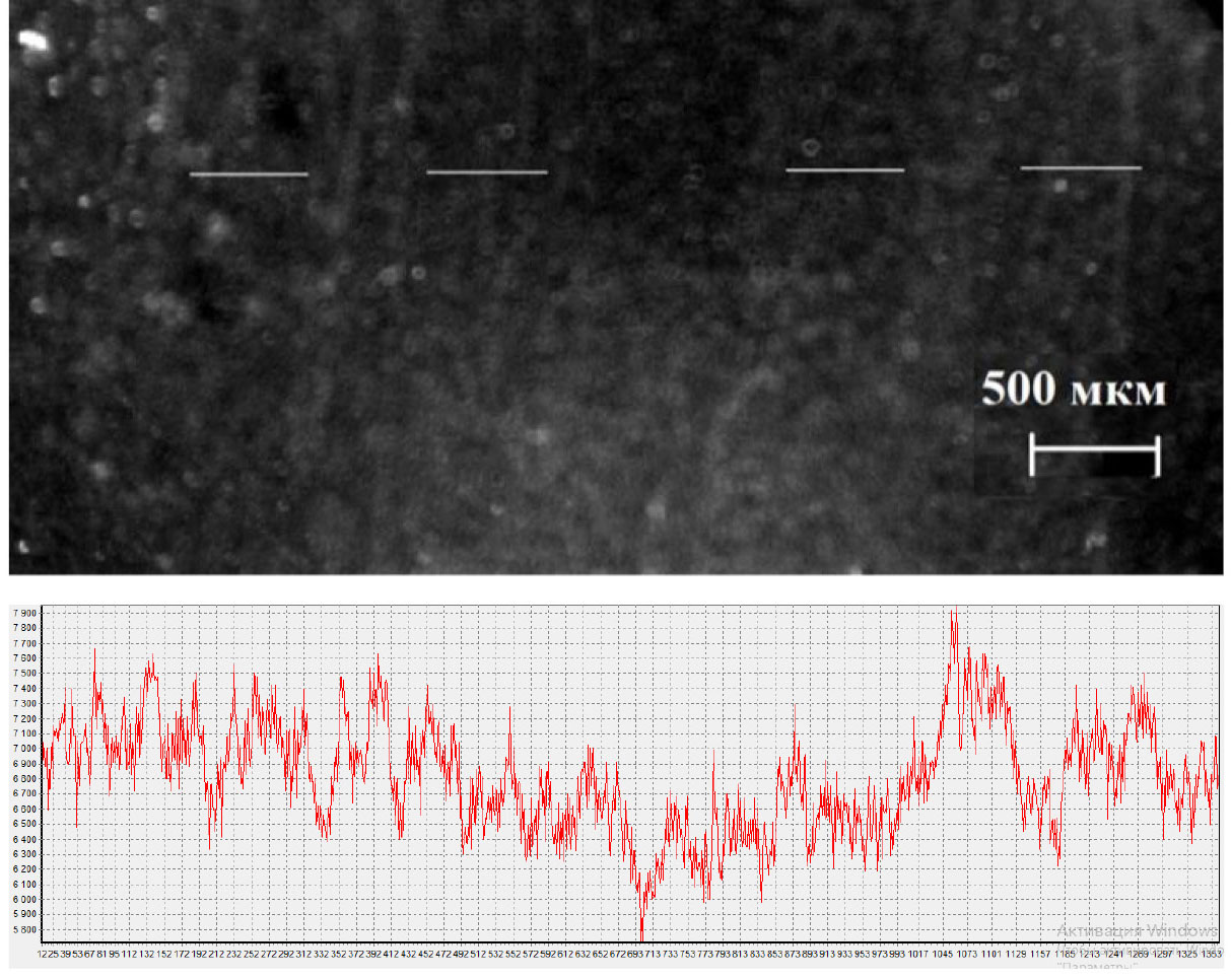 На рис. 3 представлена микрофотография ПЭТ-подложки в свете флуоресценции красителя Cy5 после аминирования 10%-ным водным раствором этилендиамина в течение 8 ч при 70°С и связывания аминогрупп с флуоресцентным красителем Cy5-pNP. Показан график распределения сигналов вдоль проведенной линии на флуоресцентном изображении подложки.