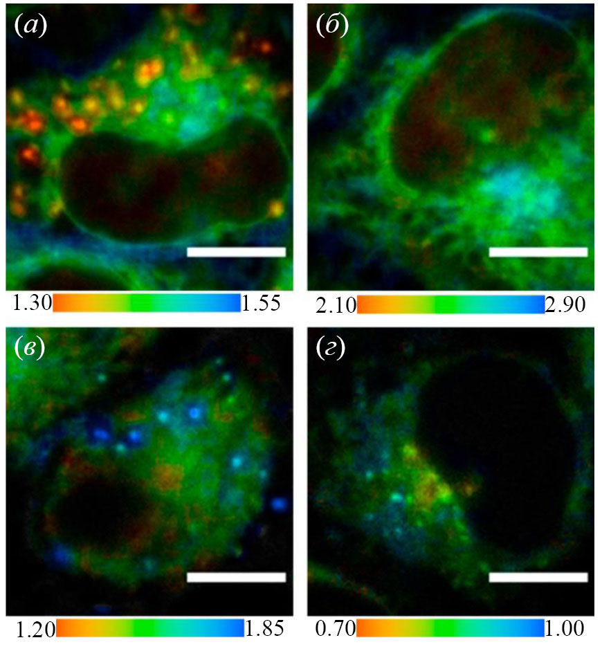 Рис. 1. Микрофотографии живых клеток HeLa Kyoto, окрашенных красителями (I) (а), (II) (б), (III) (в) и (IV) (г), полученные с использованием флуоресцентной времяразрешенной микроскопии. Цветовое кодирование отражает времена жизни флуоресценции красителей в зависимости от их окружения. Соответствующий диапазон времен жизни в наносекундах указан под каждой микрофотографией. Для красителей с двумя спектральными компонентами ((I), (III) и (IV)) в качестве значения времени жизни флуоресценции использовали амплитудно-взвешенное среднее время жизни. Масштабный отрезок – 5 мкм.
